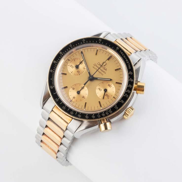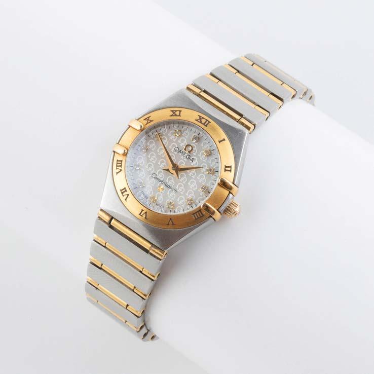 circa 2020; case #80456374; 22mm; quartz movement; fancy Omega logo mother-of-pearl dial set with 12 small diamonds; in a stainless steel case and strap with deployant buckle and gold bezel, crown and trim, working