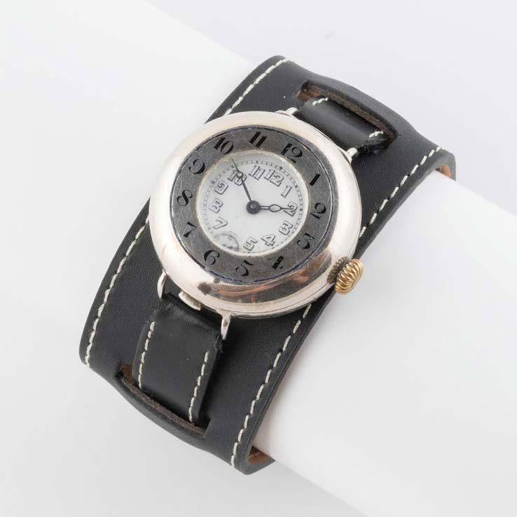 circa 1917; case #807710; 35mm; 15 jewel movement; plain white porcelain dial; in a sterling silver case with wire lugs and a spring hinged dial cover with push button release; with a leather strap with a metal buckle, working; back with engraved presentation; case, dial and movement signed; case marked with English import marks and stamped for Wilsdorf & Davis