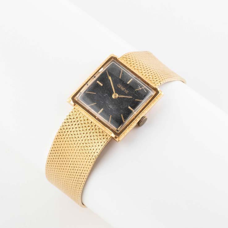circa 1960’s; 25mm square; 17 jewel cal.2812 movement; square black dial; in an 18k yellow gold case with an integrated 18k yellow gold mesh strap with concealed clasp length 7.75 in — 19.7 cm, working, some losses to dial