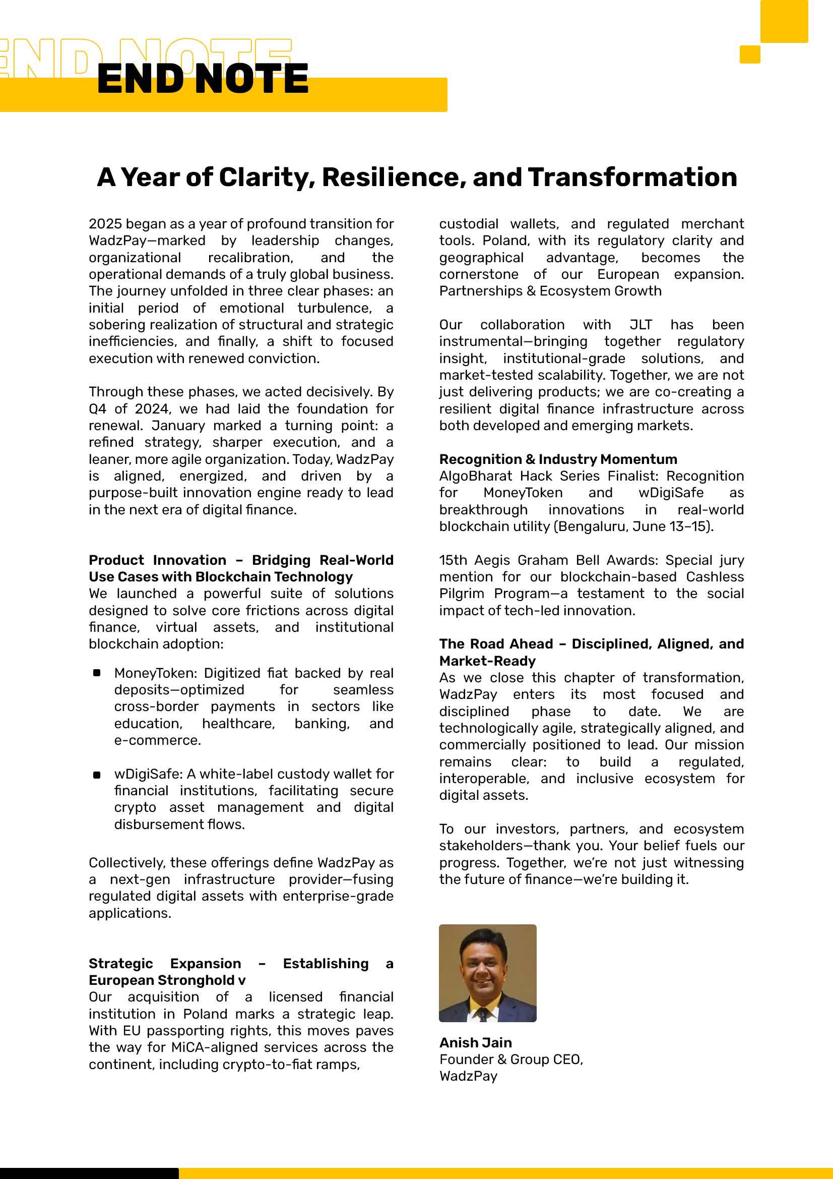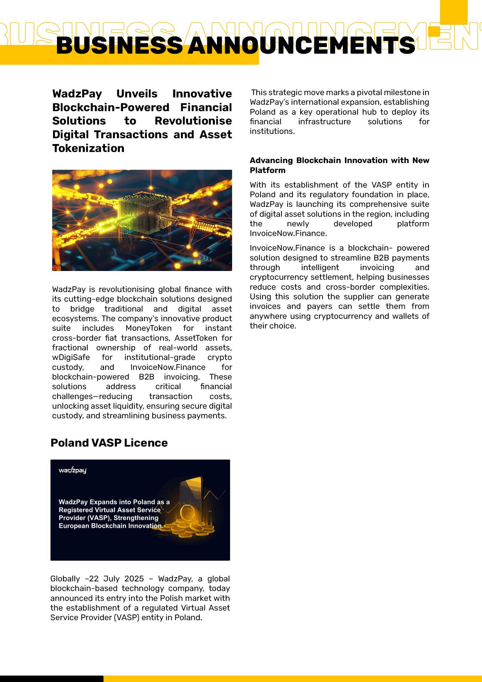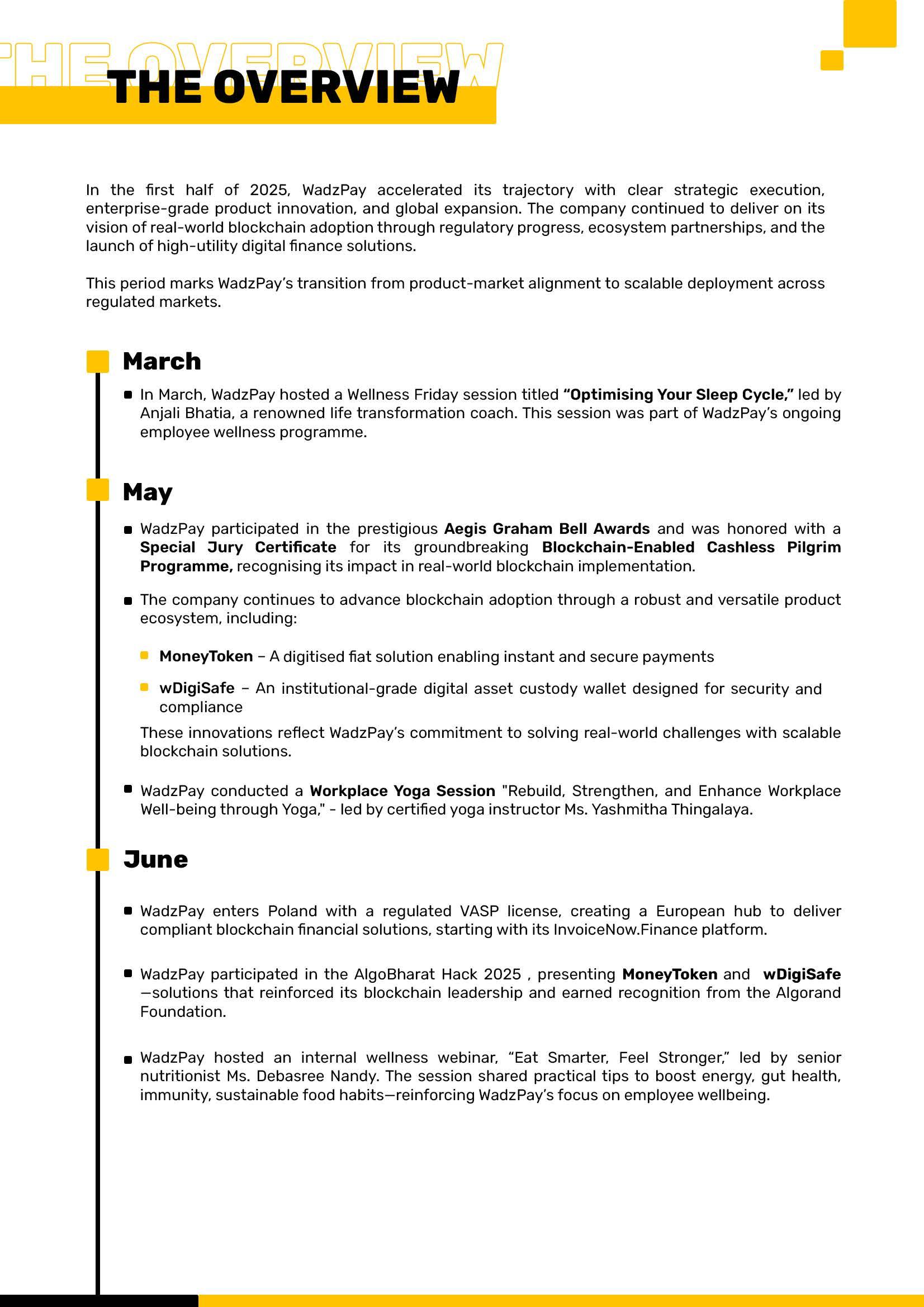 In the first half of 2025, WadzPay accelerated its trajectory with clear strategic execution, enterprise-grade product innovation, and global expansion. The company continued to deliver on its vision of real-world blockchain adoption through regulatory progress, ecosystem partnerships, and the launch of high-utility digital finance solutions.