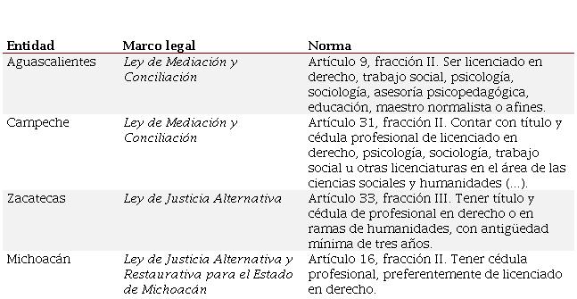 En las próximas tablas se presentan los perfiles profesionales requeridos en las 32 entidades federativas de las que se componen los Estados Unidos Mexicanos. Para ello, se realiza la siguiente clasificación: 1. Entidades federativas que marcan particularmente la licenciatura solicitada (una), 2. Entidades que implantan de modo enunciativo las licenciaturas requeridas (varias). 3. Entidades federativas que requieren que el especialista, facilitador o mediador cuente con alguna profesión (variedad profesional). 4. Entidades federativas que establecen como requisito que el especialista, facilitador o mediador esté capacitado (curso).