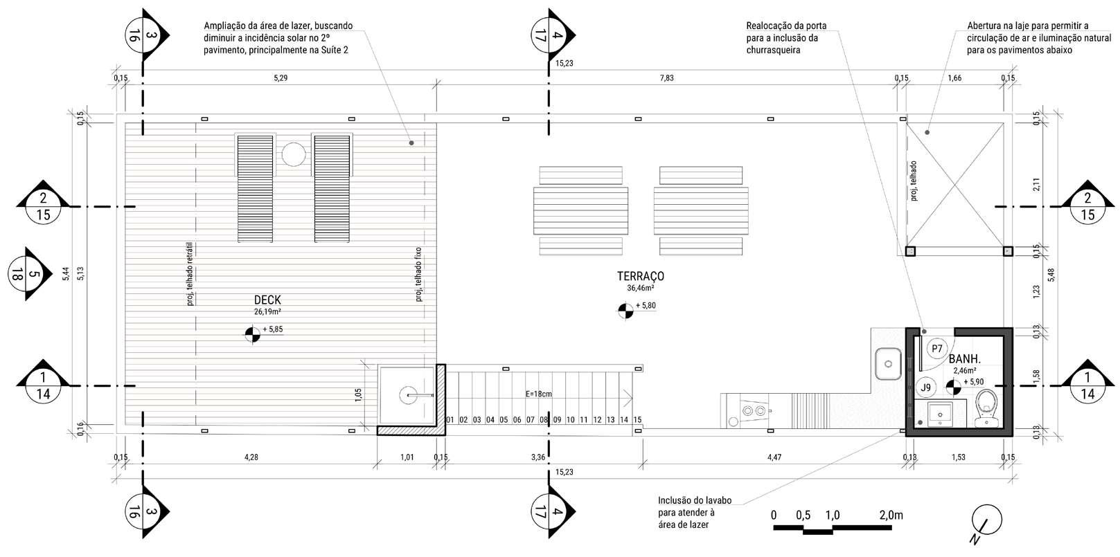 Dentre as propostas pode-se destacar a criação de uma escada mais acessível para o pavimento superior; abertura de um prisma de ventilação e a substituição da materialidade da fachada principal por cobogós, favorecendo a iluminação e ventilação no interior da edificação.