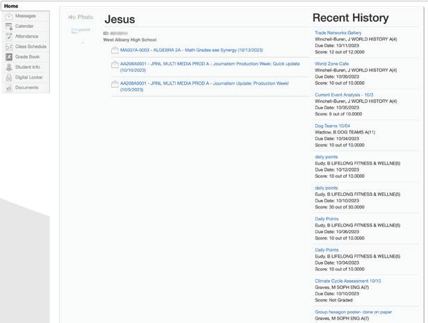 On the left hand side of the website you can find all of the different categories on Synergy. The top category is the home screen, where you can see your messages in the middle and you can also see your recent history on the right hand side of the screen. In recent history you can see your assignments and the grade you got on an assignment or see if they have not been graded yet.
