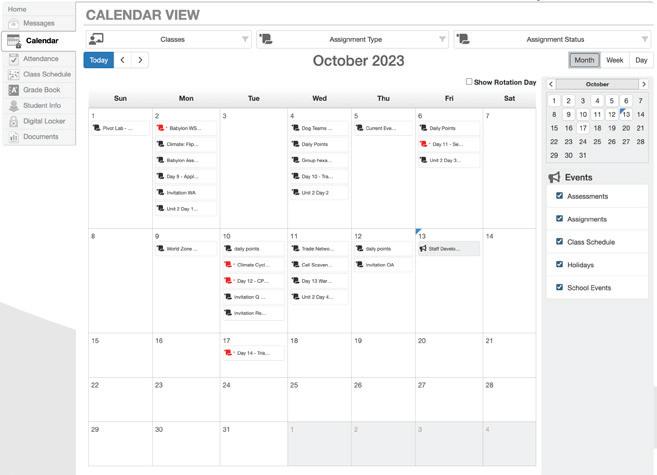 The third category is the calendar. You can filter it out by months, weeks, or simply just see a day. You can also filter out the calendar to see events at school like assessments, assignments, class schedules, holidays, or to see the school events. When looking at assignments on the calendar you can see the grade you got and when an assignment is red on a day it means that it has not been turned in yet.