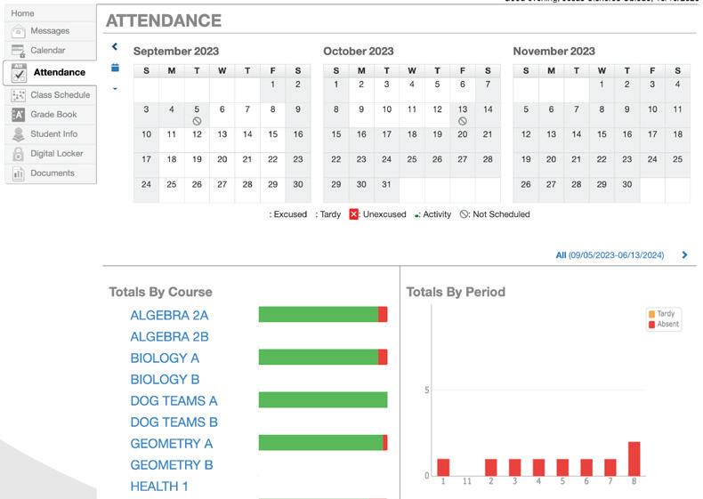 The fourth category is the attendance, here you can see which days you have been absent for and which days you’ve been present. If you have an unexcused absence for a day you can hover your mouse over the day and it will tell you the reason for the absence. If it is an unexcused absence then there will be a red X covering the day on the calendar.