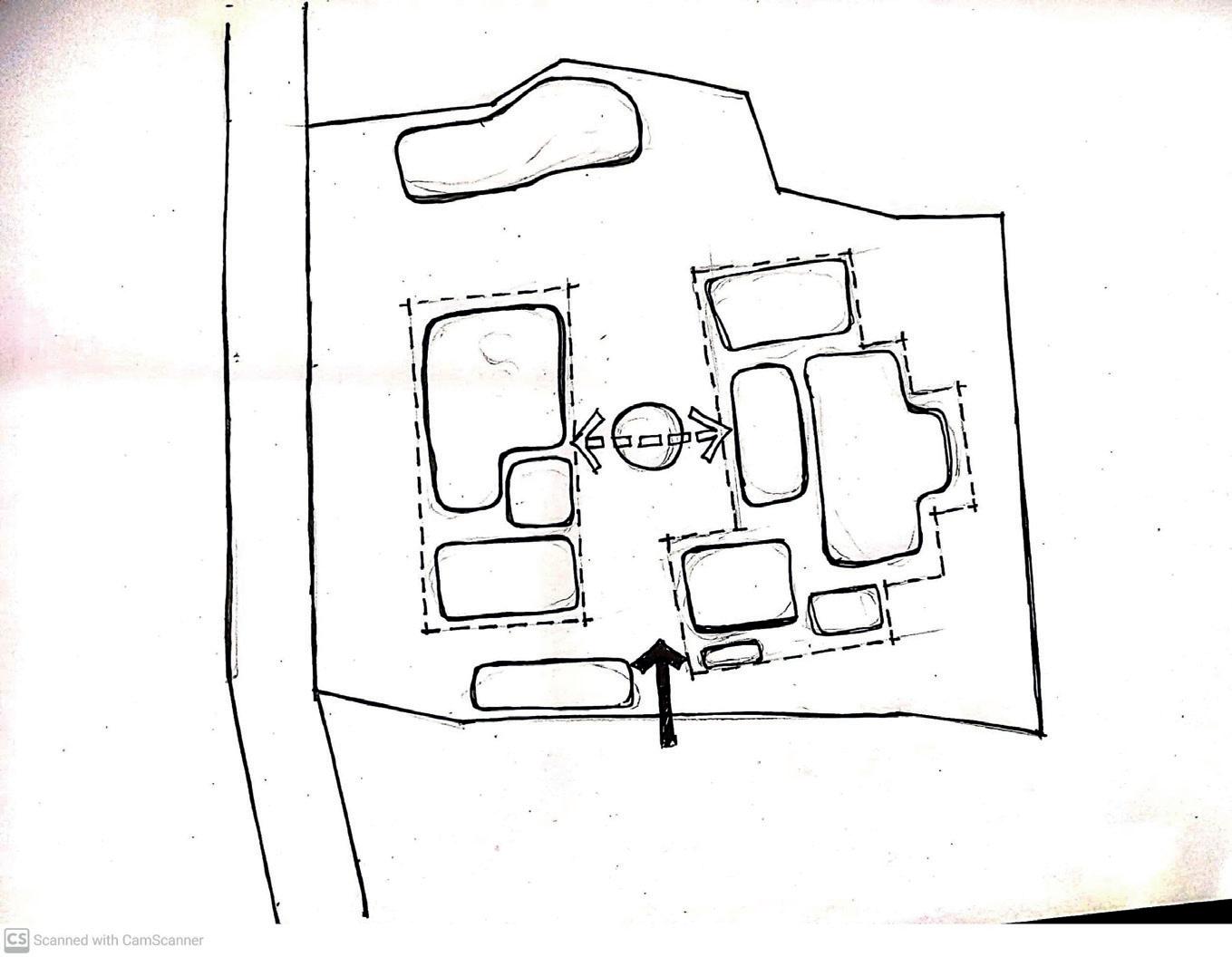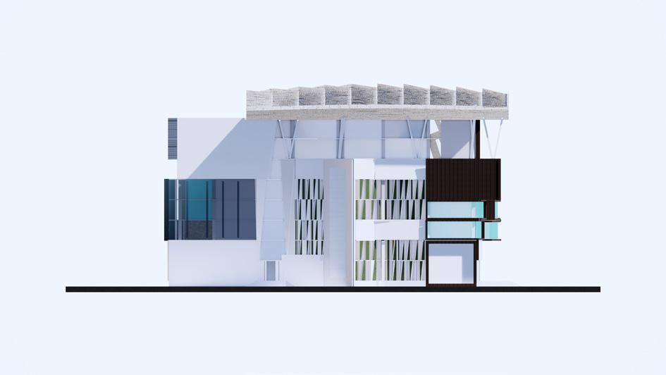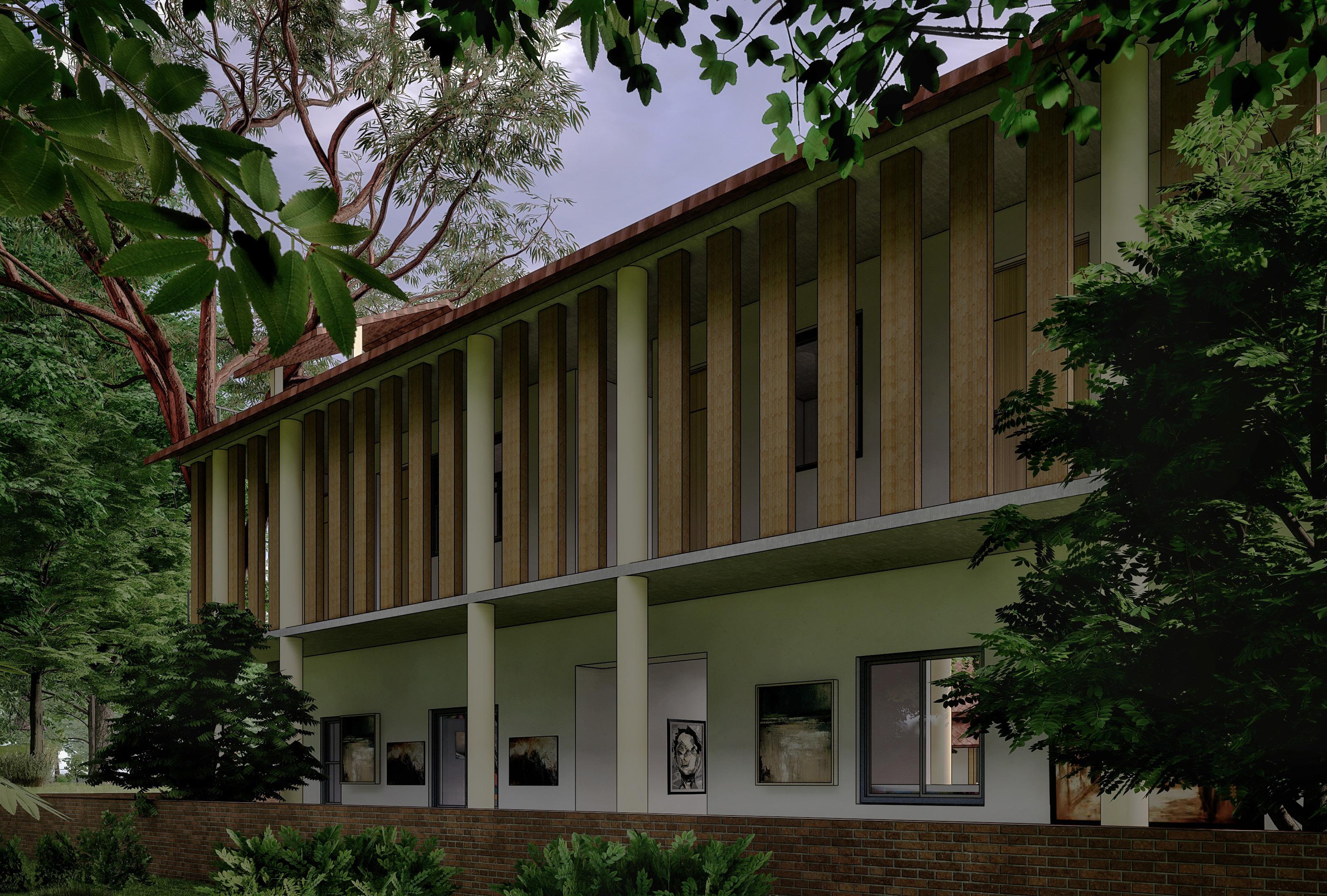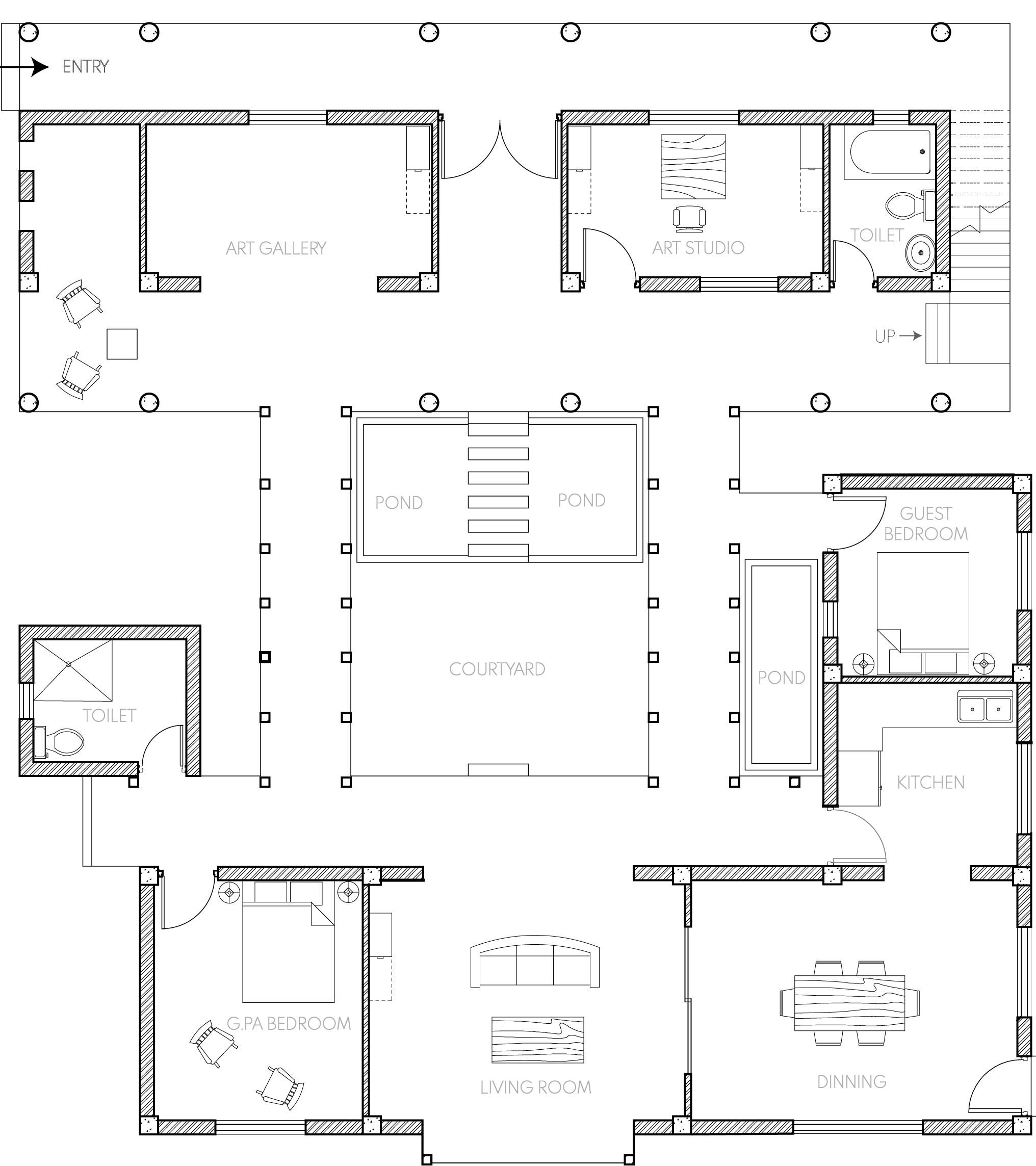 Oblique entry to the building where people experience narrow to open space with open courtyard welcoming by water bodies.We have public space near the entry where people can visit art gallery and consult with artist for project. Art project has been display throughout the corridor and veranda making it multi functional. Open Living room is sited near the river enjoying spectcular view and experincing landscape and soundscape through it. Dinning and Kitchen has been placed to proximity of living room where as grandparents room also has been placed near it so that they can easily move out for daily activities.Bed room are placed at first floor for privacy of family.