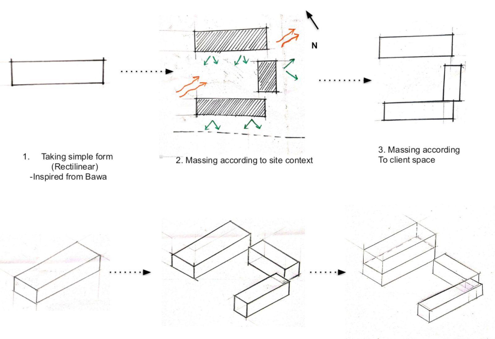 This idea and bawa‘s inspiration makes me to create shelter where wild flora and people lives inside and outside space by not limiting jungle to conservation area only. Addressing jungle near site,and not discontuing jungle wilderness but bringing that into shelter which allow villa to completely lost into nature and enjoy all the beauty , blessings of nature living in it.
