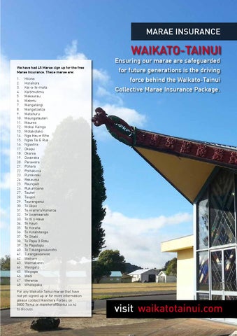 We have had 48 Marae sign up for the free Marae Insurance. These marae are: 1. Hiiona 2. Horahora 3. Kai-a-te-mata 4. Kaitimutimu 5. Makaurau 6. Maketu 7. Mangatangi 8. Mangatoatoa 9. Matahuru 10. Maungatautari 11. Maurea 12. Mokai Kainga 13. Motakotako 14. Nga Hau e Wha 15. Ngaa Tai E Rua 16. Ngaatira 17. Okapu 18. Okarea 19. Owairaka 20. Parawera 21. Pohara 22. Poihakena 23. Purekireki 24. Rakaunui 25. Raungaiti 26. Rukumoana 27. Tauhei 28. Taupiri 29. Tauranganui 30. Te Akau 31. Te Aramiro/Kaharoa 32. Te Awamaarahi 33. Te Iti o Haua 34. Te Kauri 35. Te Koraha 36. Te Kotahitanga 37. Te Ohaki 38. Te Papa O Rotu 39. Te Papatapu 40. Te Tokanganuianoho 41. Turangawaewae 42. Waikare 43. Waimakariri 44. Waingaro 45. Waipapa 46. Waiti 47. Weraroa 48. Whatapaka
