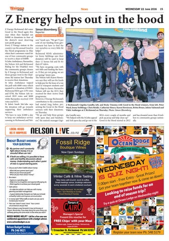 Z Energy helps out in the hood Z Energy Richmond did some Good in the Hood again this year when they handed out $4000 in donations to four of the district’s most deserving non-profit groups. Every Z Energy station in the country ran the annual Good in the Hood programme in May when their customers voted for one of four community groups to receive a share of $4000. St John Ambulance, Barnardos, the Nelson Ark and Richmond Riding for the Disabled were the community groups chosen by Z Energy in Richmond and those groups went to the Gladstone Rd station last Thursday to receive their donations. St John Ambulance topped the poll with 6000 votes which equated to a donation of $2043. Richmond RDA got 2170 votes and $738, the Nelson Ark received 2019 votes and $688 while Barnardos received 1559 votes and $531. St John’s Sarah McCabe says the donation will go towards supporting their ambulance services. “We have to raise $1000 a day to keep our ambulance service running in Richmond and Nel-
