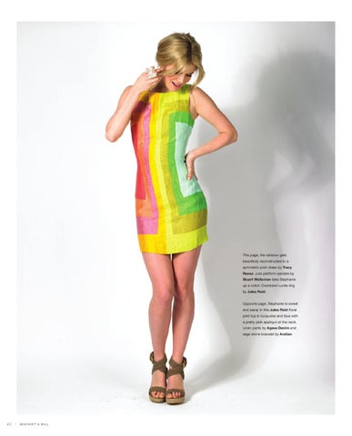 This page, the rainbow gets beautifully reconstructed in a symmetric print dress by Tracy Reese. Jute platform sandals by Stuart Weitzman take Stephanie up a notch. Oversized Lucite ring by Jules Reid. Opposite page, Stephanie is sweet and sassy in this Jules Reid floral print top in turquoise and blue with a pretty pink appliquĂŠ at the neck. Linen pants by Agave Denim and sage stone bracelet by Andian.