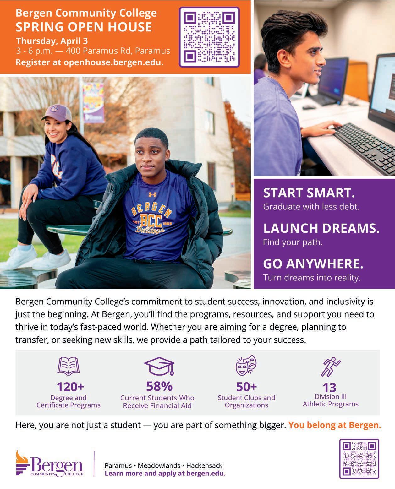 just the beginning. At Bergen, you’ll find the programs, resources, and support you need to thrive in today’s fast-paced world. Whether you are aiming for a degree, planning to transfer, or seeking new skills, we provide a path tailored to your success at three convenient locations in Paramus (main campus), Hackensack, and Lyndhurst. Learn more and enroll at www.bergen.edu.