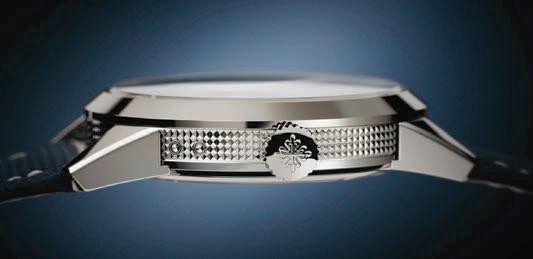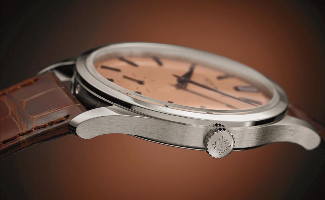 The watch’s polished platinum case is 38 millimeters—slightly larger than its predecessor, the 5196— and features a smooth, beveled bezel with satin-finished flanks. As with all platinum models offered by Patek, the caseband is elegantly adorned with a brilliant-cut diamond at 6 o’clock.