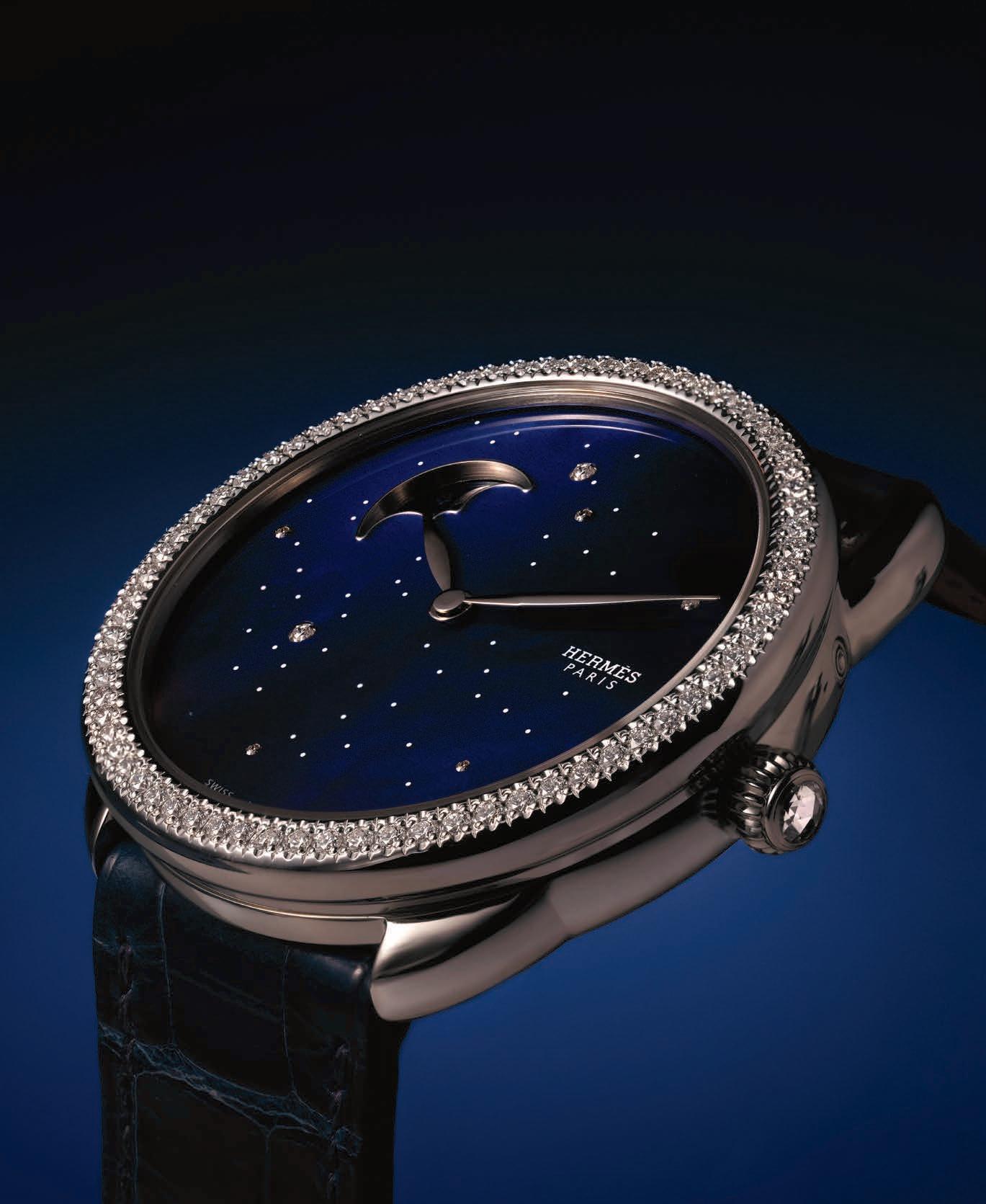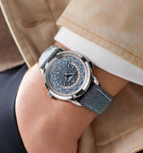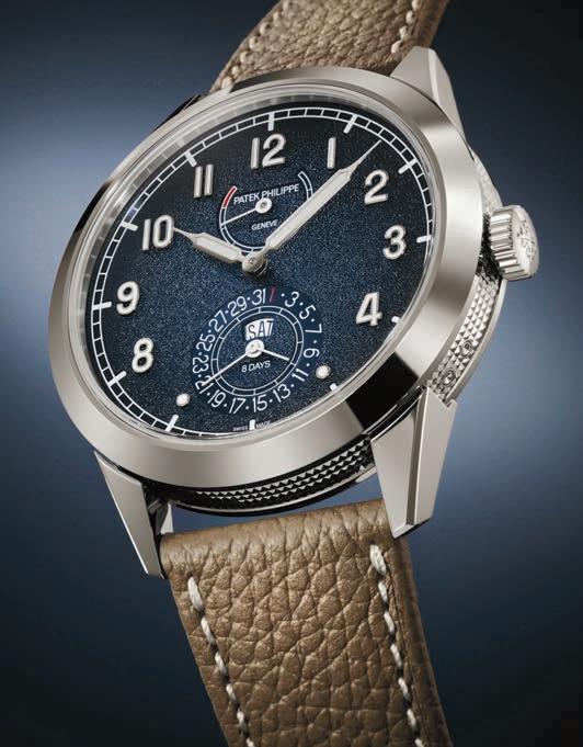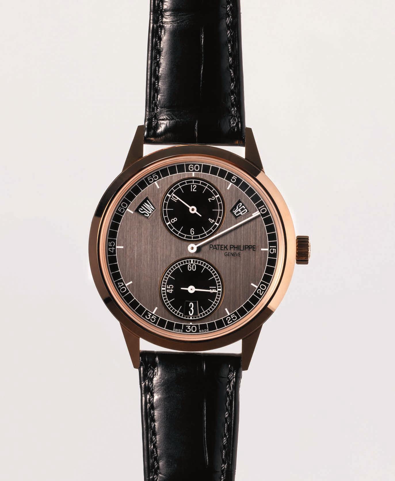With all its indicators in a vertical line, the 5328G is a paragon of balance and legibility. Its textured blue dial with a black-gradient rim features applied numerals as well as hour and minute hands, all in white gold with white luminescent coating. A small hand marks the seconds at 6 o’clock in the day-and-date subdial. Offered with two straps—a fabric-patterned, navy-blue calfskin with cream stitching as well as a grained taupe calfskin—and with a new patented triple-prong foldover clasp, the Calatrava 5328G-001 goes for $74,170.
