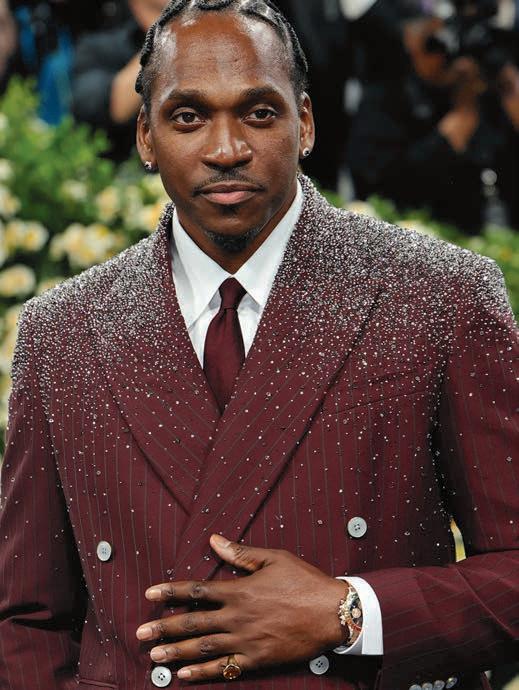 To complement a hand-embroidered Louis Vuitton burgundy pinstripe suit, the 48-yearold rapper rocked one of Rolex’s boldest examples of technical excellence and artistic play. Ref. 116595RBOW features a bezel set with 36 baguette-cut sapphires arranged in a color gradient, hence the nickname, and an Everose gold bracelet.