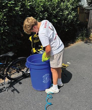 Left: Charlie Ashley hitches a wagon to his bike and rides to customers’ homes. Above: Ashley in action, cleaning out a recycling can.