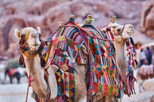 From top: Jordan’s picturesque landscape includes el-Deir, a monument carved out of rock in the ancient city of Petra. Local women in Petra dress in traditional, ornate veils. Riding on camelback is an easy mode of transportation for locals and visitors alike.