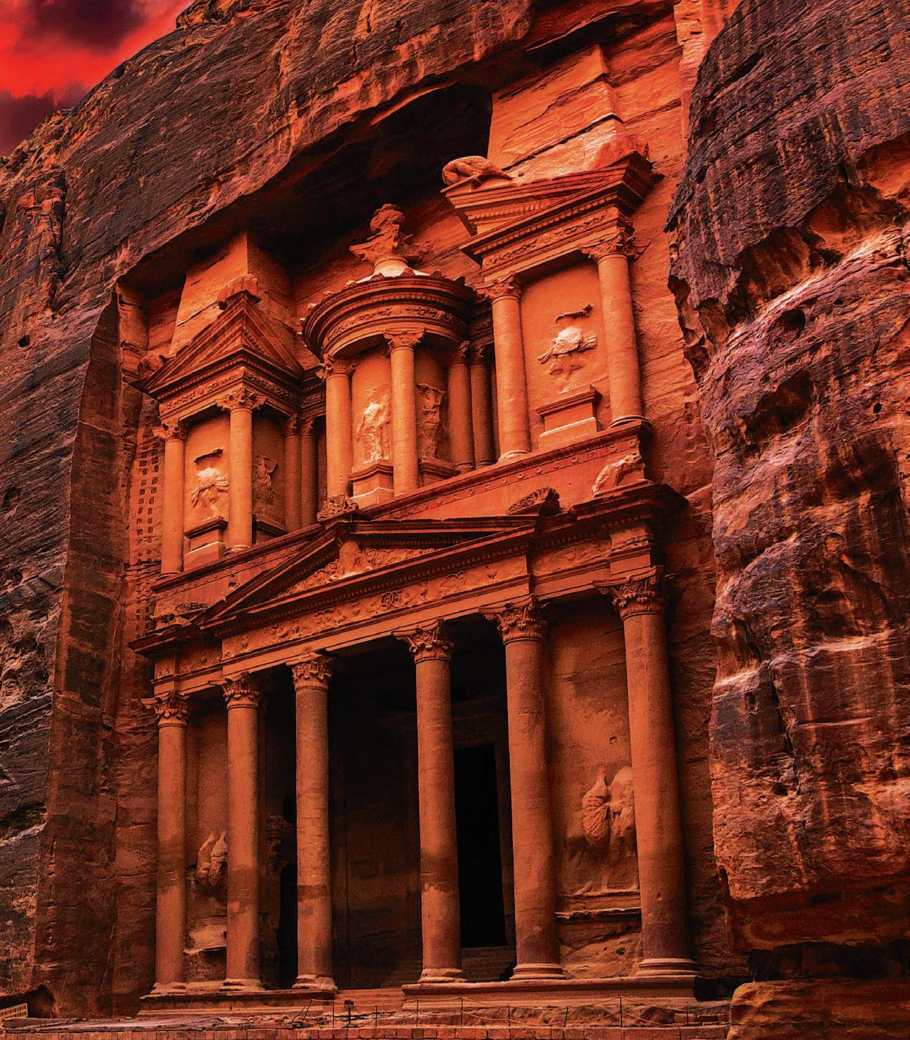 A nomadic Arabic people, the Nabataeans, built this city. It’s astonishingly beautiful and surprising, a wonder of the world that is even more striking in person than in the many films it’s been featured in, including Indiana Jones and the Last Crusade . A forgotten city, it was rediscovered in 1812 by the Swiss explorer Johann Ludwig Burckhardt. The treasury is the most famous building, yet it’s just one of the fantastic structures in this UNESCO World Heritage Site. There are temples, royal tombs and even a nymphaeum, a monument dedicated to nymphs. Perhaps the most remarkable thing about Petra is that its appearance changes within a few hours. As the sun moved, I saw the colors of the sandstone go from burnt orange to pink to gray, as if the walls were alive.