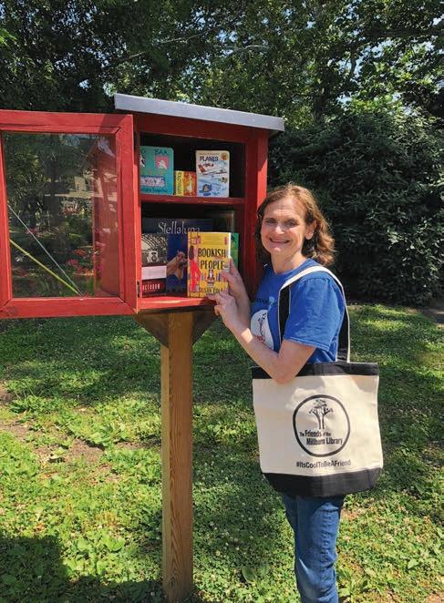 Right: Dorothy Kelly refills the Taylor Park Little Free Library. She helped launch the program in 2020 with the Friends of the Millburn Library board. Photograph by Mara Epstein.