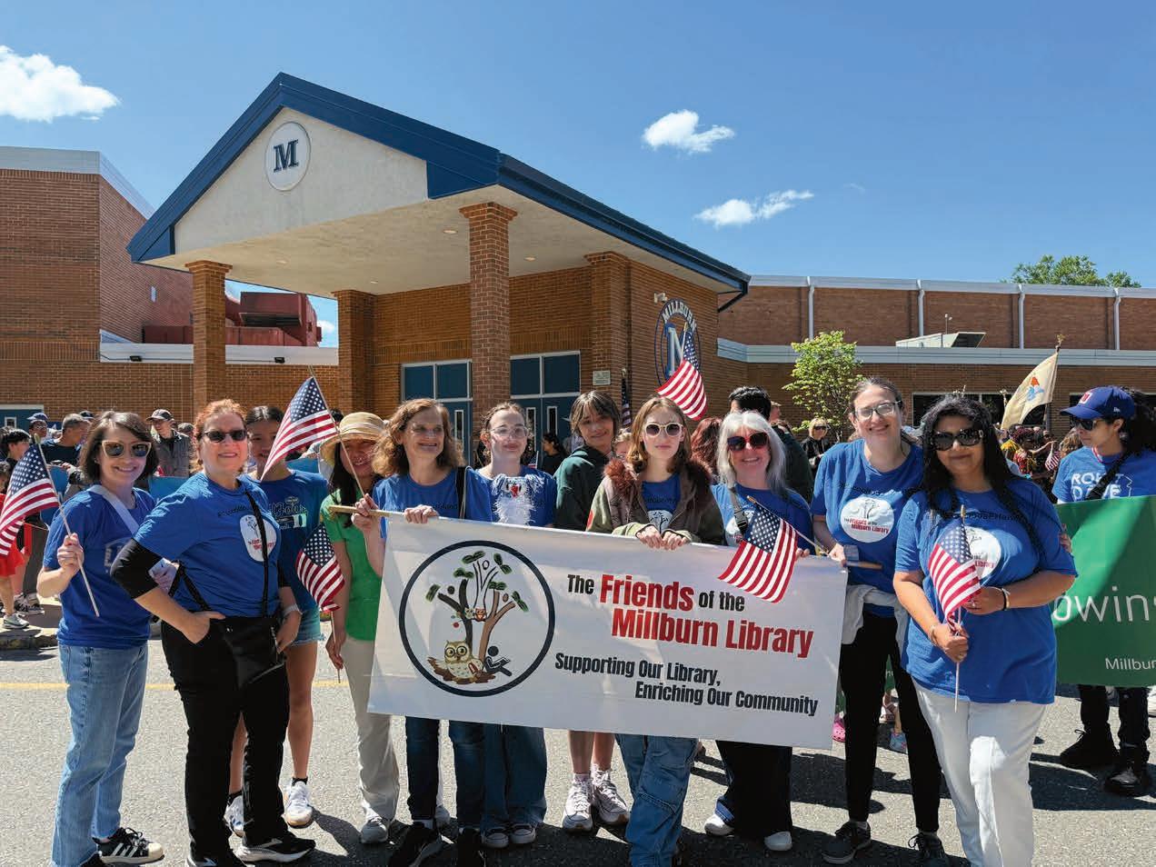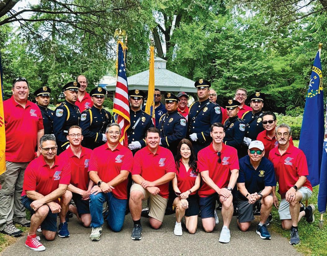 Opposite page: Dorothy Kelly (far left of flag) continues her dedicated service to the community—Friends of the Millburn Library Board Members at the 2025 Memorial Day Parade, Millburn High School. Photograph by Sapna Gupta. This page: Fourth of July Committee members gather with the Millburn Police Honor Guard at last year’s Fourth of July celebration to pay tribute to first responders. Photograph by Millburn Short Hills Fourth of July Committee.