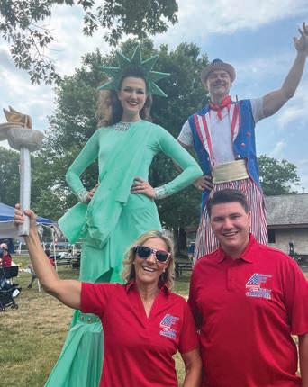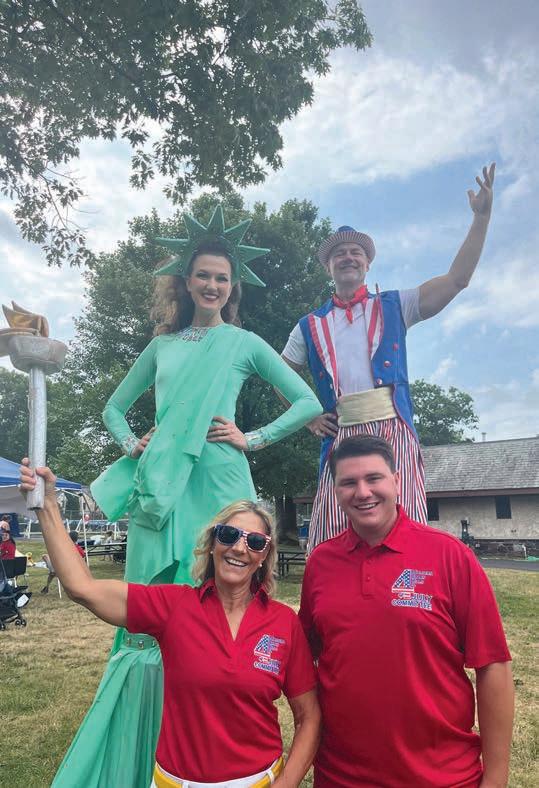 Left: Ellen and Jamie Serruto of the Fourth of July Committee with Lady Liberty and Uncle Sam at the 2024 morning event in Taylor Park. Photograph by Millburn Short Hills Fourth of July Committee.