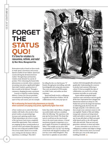 FORGET THE STATUS QUO! It’s time for retailers to reexamine, rethink, and redo! By Marc Weiss, Management One Reinvention today is based on three trends in retail: speed, convenience and scarcity. Speed to market of new fashion. Speed and scarcity driving the elevated streetwear market. Through drops and launches, vendors create demand via scarcity of product. We’re witnessing the beanie baby phenomenon on steroids, where customers are paying crazy prices, significantly higher than retail. Granted, a good portion of this is resold on the Internet. Through ecommerce, shopping becomes convenient. Scarcity is created by vendors limiting delivery. Comme Des Garcons precludes oversaturation by limiting their accounts’ open-to-buy each season, just one example