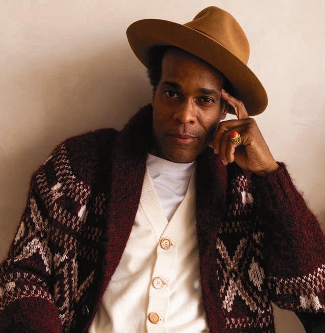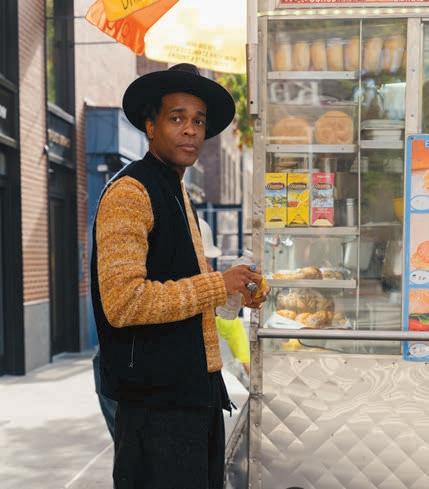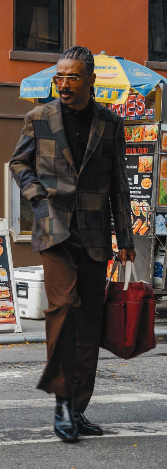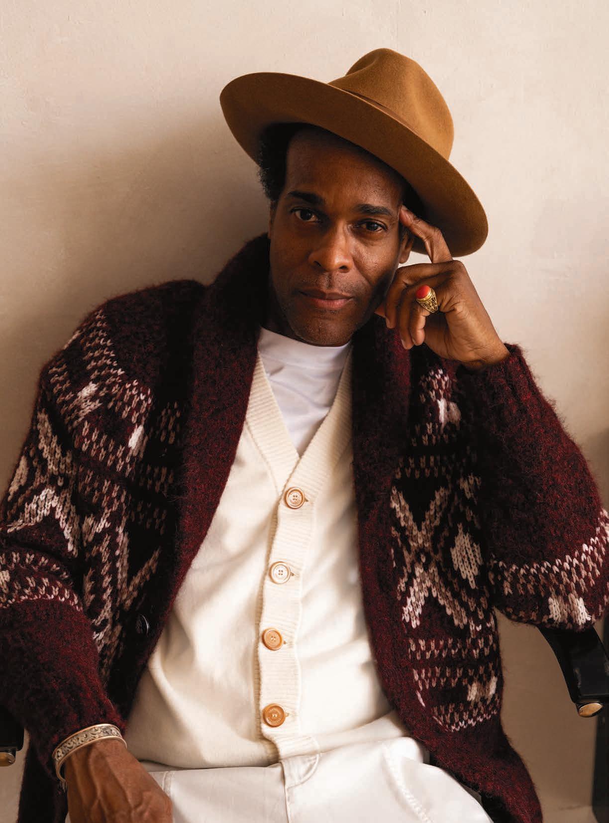 Left, on Ontario: Mandelli coat and pants, Brunello Cucinelli sweater and T-shirt, Ghurka duffel, Septieme Largeur boots. Center, on Guerre: Borsalino hat, Kiton jacket, Raffi sweater, Heritage Gold pants, Bresciani socks, Jacques Solovière shoes. Right, on Kamau: Brooks Brothers blazer, Grand Sasso knit top, DL1961 pants, Steele bag, St. Laurent boots. 37