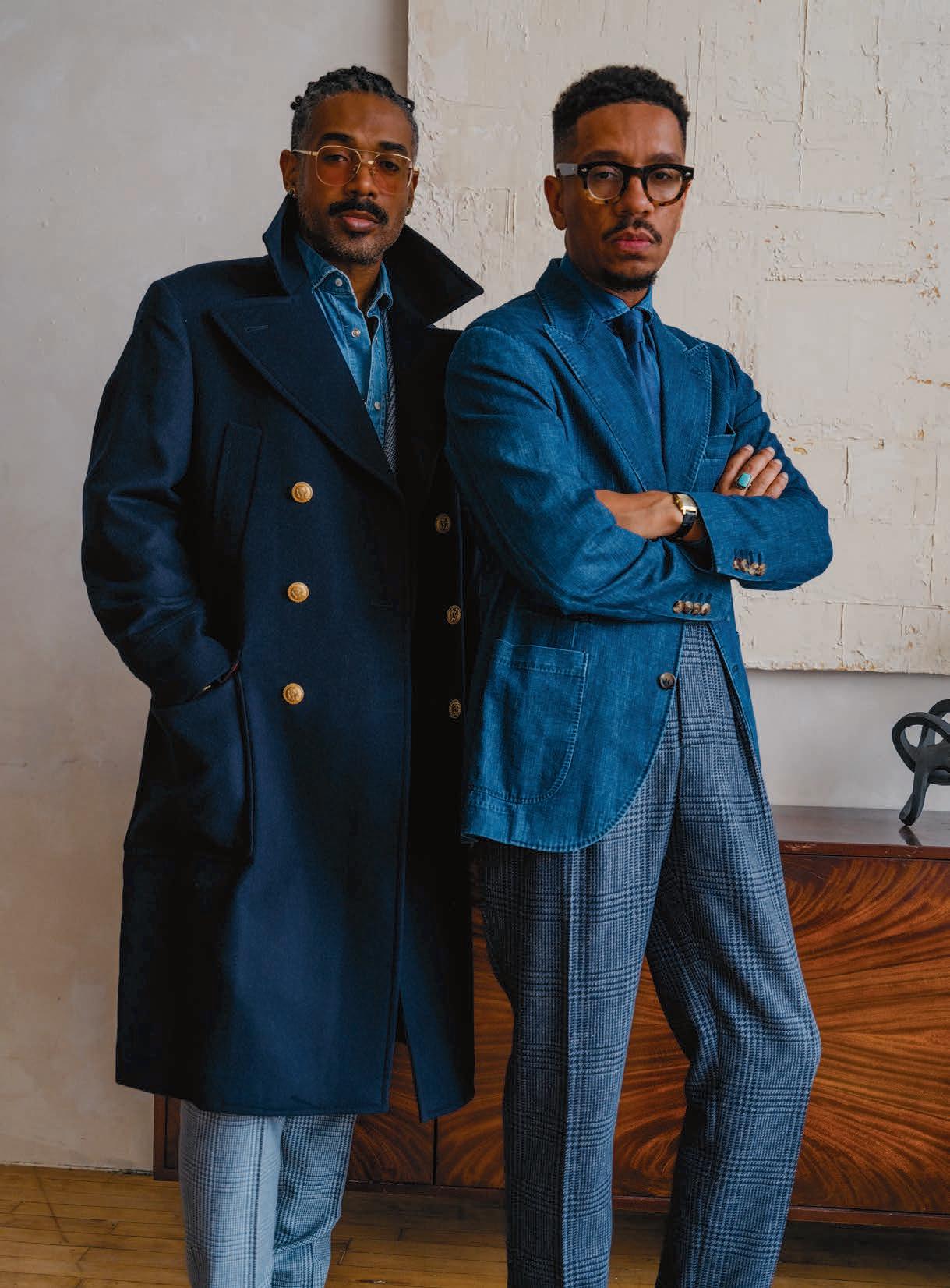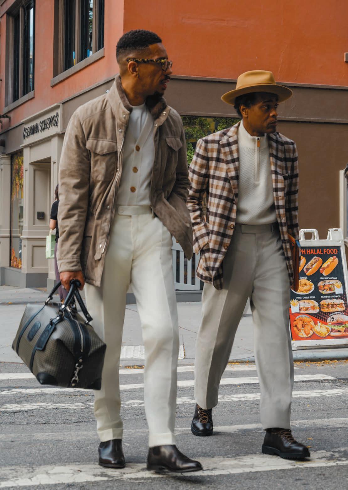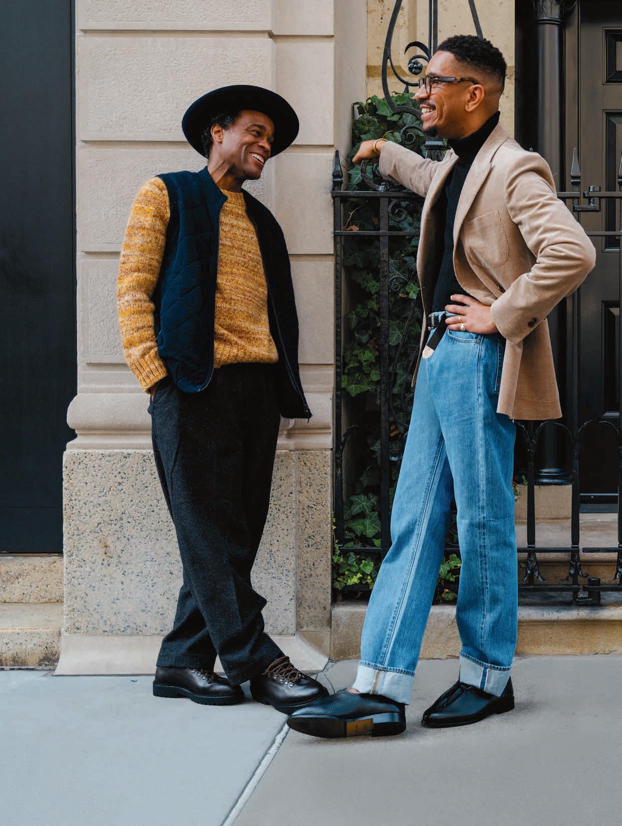 On Guerre, left, Borsalino hat, Manto jacket, Zanella trousers, Oncept sneakers. On Kamau, right, Manto jacket, Buck Mason trousers, Saint Laurent boots.