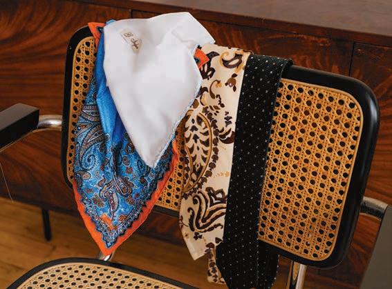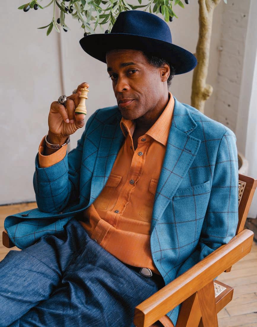 Opposite, clockwise from upper left: Craig Hill knife and corkscrew, S.T. Dupont lighters, Ettinger catch-all, Tateossian bracelets. Ontario wears a Raffi sweater. Kamau in Universal Works jacket and his own denim. This page, below: Pineider pens, journal, and chess set. Right, on Guerre: Borsalino hat, Heritage Gold blazer and trousers, Sartorio shirt. Bottom right: G. Inglese white pocket square, Edward Armah paisley pocket square, Stefano Cau paisley necktie, Bonobos neat necktie.