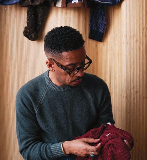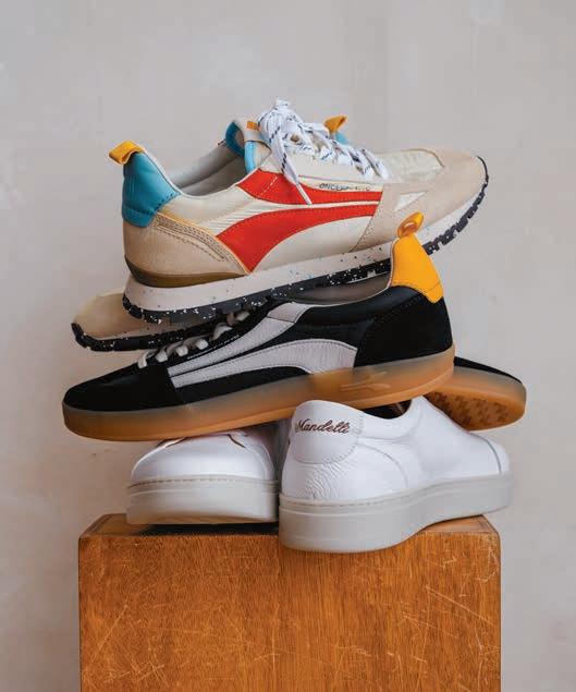 This page, right: On mannequins, Kiton sportcoat and necktie, Brunello Cucinelli shirt. Perry Ellis blazer, Stenström turtleneck. On Kamau, Brooks Brothers blazer, The Armoury shirt, DL1961 jeans, St. Laurent boots. Opposite page, clockwise from upper left: Oncept sneakers, Mandelli sneakers. Perry Ellis, Gala, Far Afield, Universal Works, Original Penguin sweaters. Tateossian jewelry. On Ontario: Perry Ellis jacket, Raffi sweater, Mandelli trousers, Jacques Solivière shoes. On floor: Footwear by Brunello Cucinelli, Sanders, and Paolo Scafora On mannequins, Heritage Gold sportcoat, Brunello Cucinelli sweater, Daniel Hechter suit jacket, Robert Talbott shirt, Stefano Cau necktie.