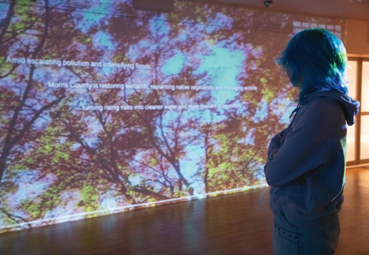 The video installation “Perennial Land,” which runs through April 5, includes words and images related to local environmental issues. In addition to footage of the Frelinghuysen Arboretum, text running across the screen at one point reads: “Amid escalating pollution and intensifying floods, Morris County is restoring wetlands, replanting native species, and managing wildlife—turning risks into cleaner water and stronger, more resilient ecosystems.”