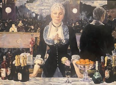 “Iconic: Kathleen Gilje Repaints Art History” (through April) reimagines masterworks from Leonardo da Vinci and others to create a conversation on beauty, culture, and female agency. Left: Feminist art scholar Linda Nochlin as the barmaid in Manet’s “A Bar at the Folies-Bergère.”
