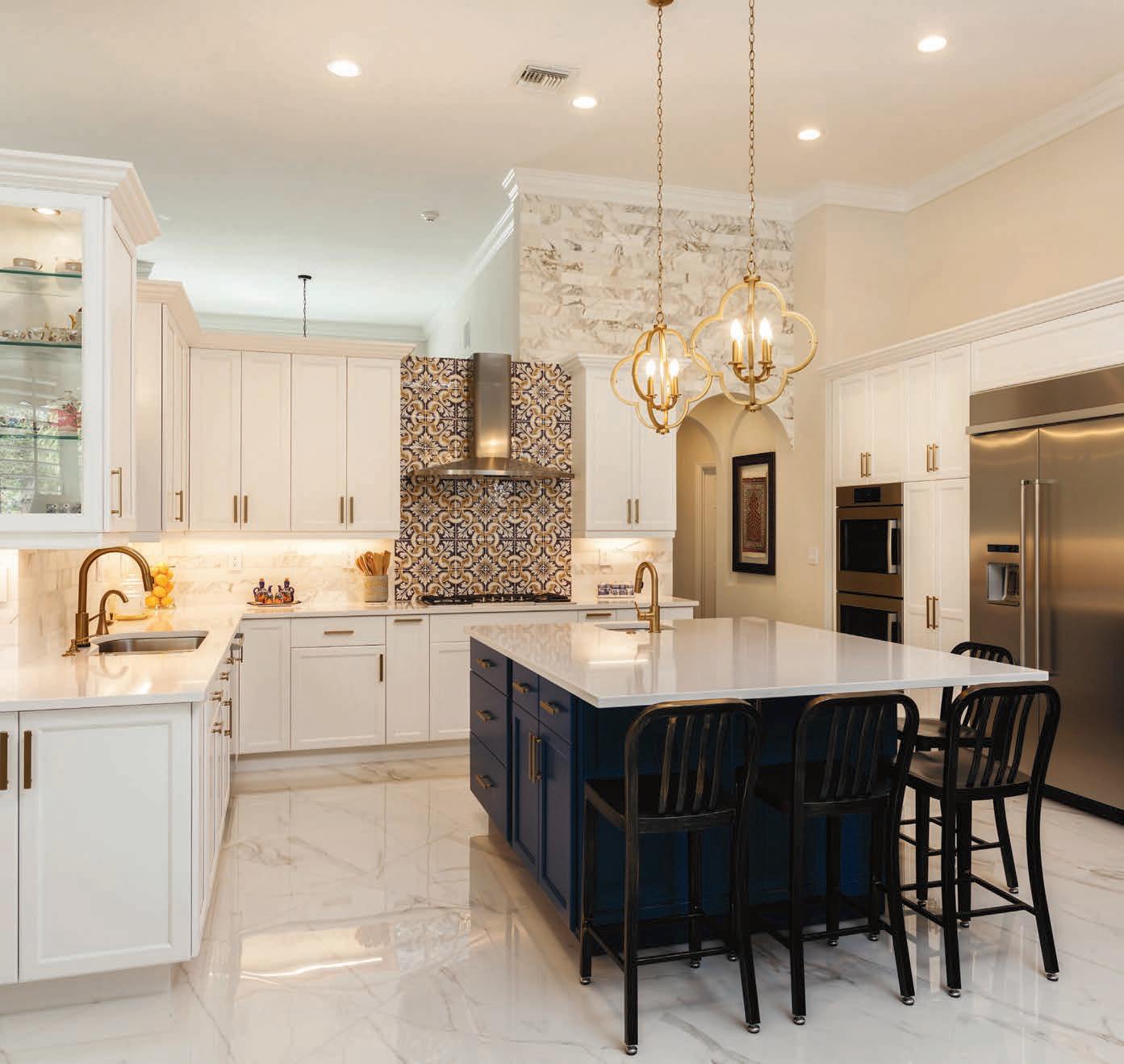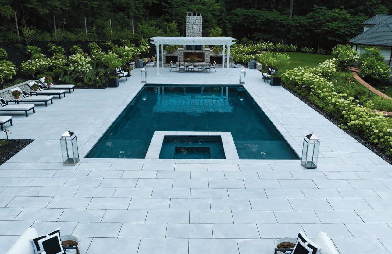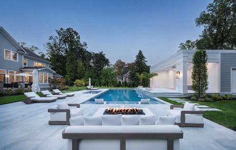 the great room to the cabana area with outdoor floor pillows so that the kids could plop down and play games. “We wanted our outside furniture to coordinate with the exterior,” she adds, hence the color scheme. Tying in with the star of this yard— the in-ground pool—the outdoor kitchen is bright and blue with its three-dimensional tile.