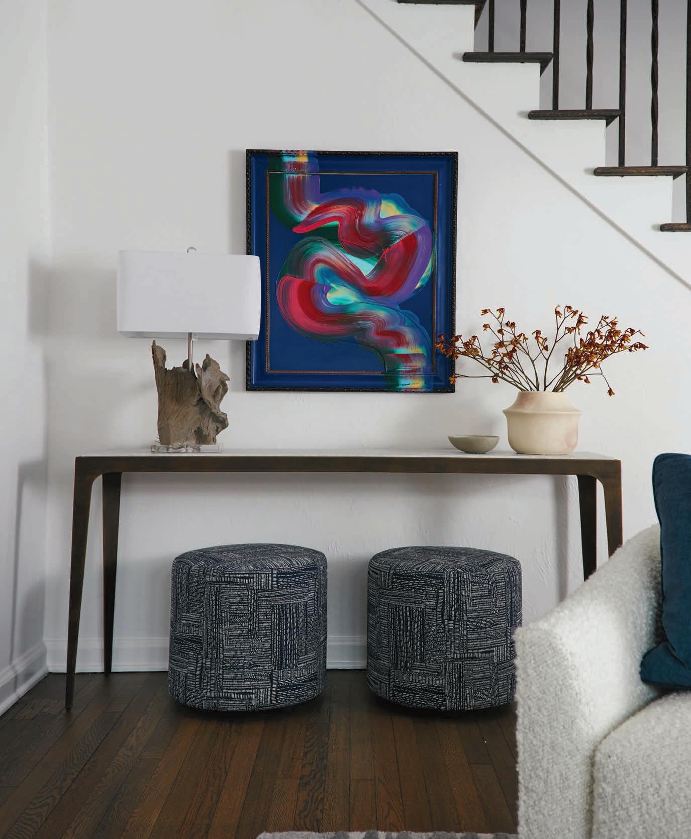 Between the armchairs, the Jayson Home wood-stump table pays homage to the ceiling’s beams while the dark-toned Artistica Home Rousseau coffee table helps ground the seating group. The Bernhardt Pisa ottomans, customupholstered in Rebecca Atwood fabric featuring a white stitch over navy background, supplement the other seating pieces. Decorative touches such as the Toral Patel painting from J. Nunez Gallery, the Lily’s Living marble disk sculptures atop the mantel and the Scala hand-forged floor lamp, enhance the room’s appeal.