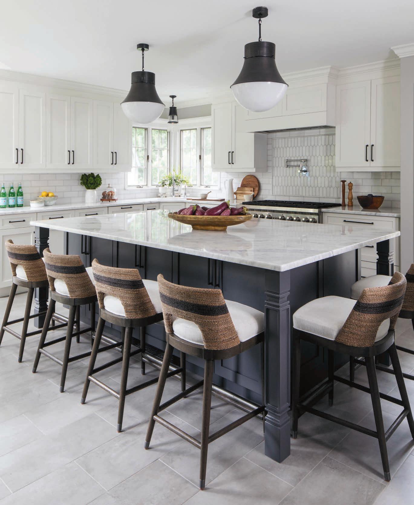 Keeping it light, the Shaker-style cabinets are white with contrast from black metal hardware. Marrying black metal and white glass, twin pendants by Visual Comfort over the island are “almost like hanging pieces of art.” Ditto for the sink-area singular pendant.