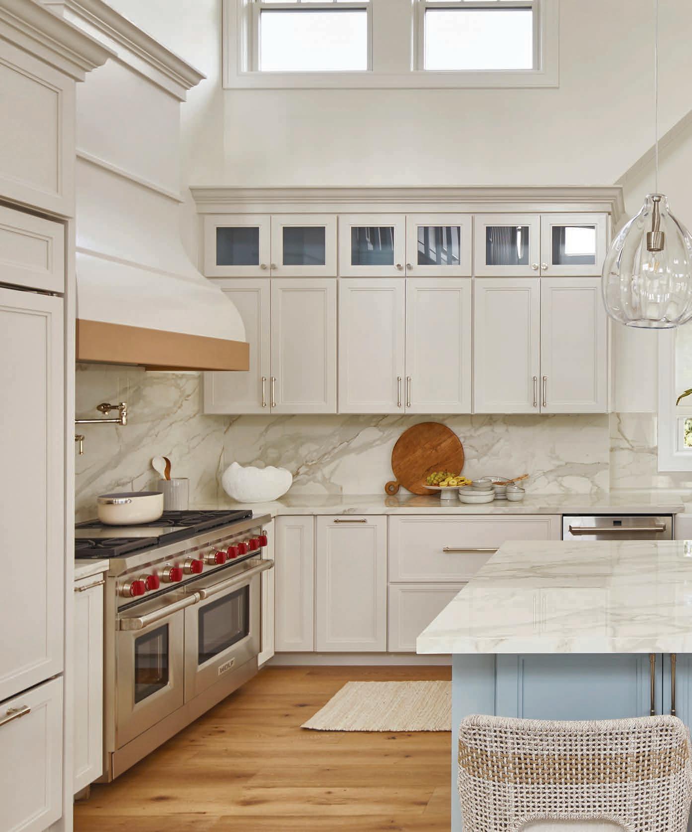This Avalon kitchen set in motion the pops of blue that brighten the home’s neutral palette. This page: A coco-shell chandelier in the eating area draws from nature for a light of delight. Opposite: Far from the eyesore designer Karen Wolf feared, the hood became a style hero after conquering exposed venting.