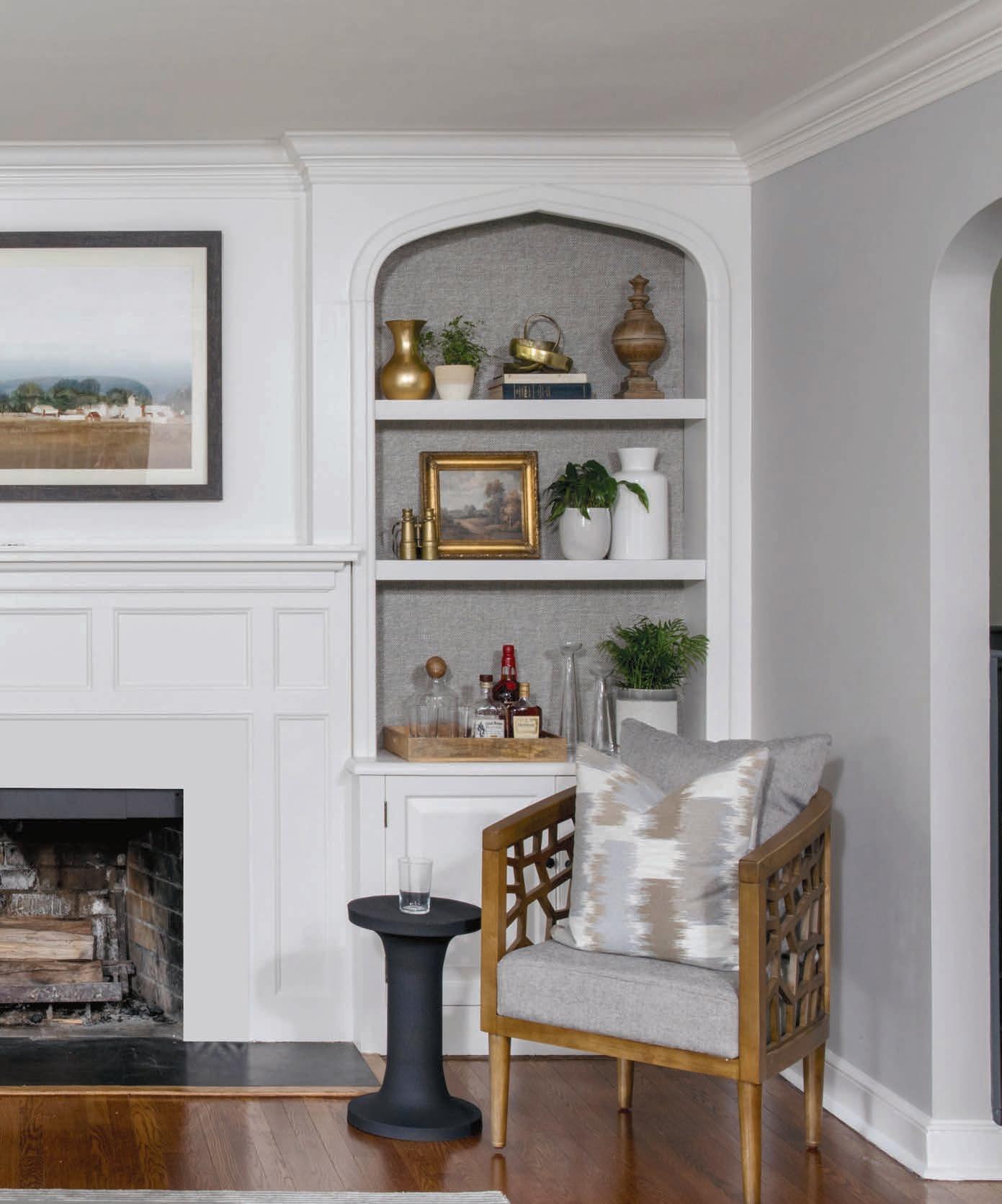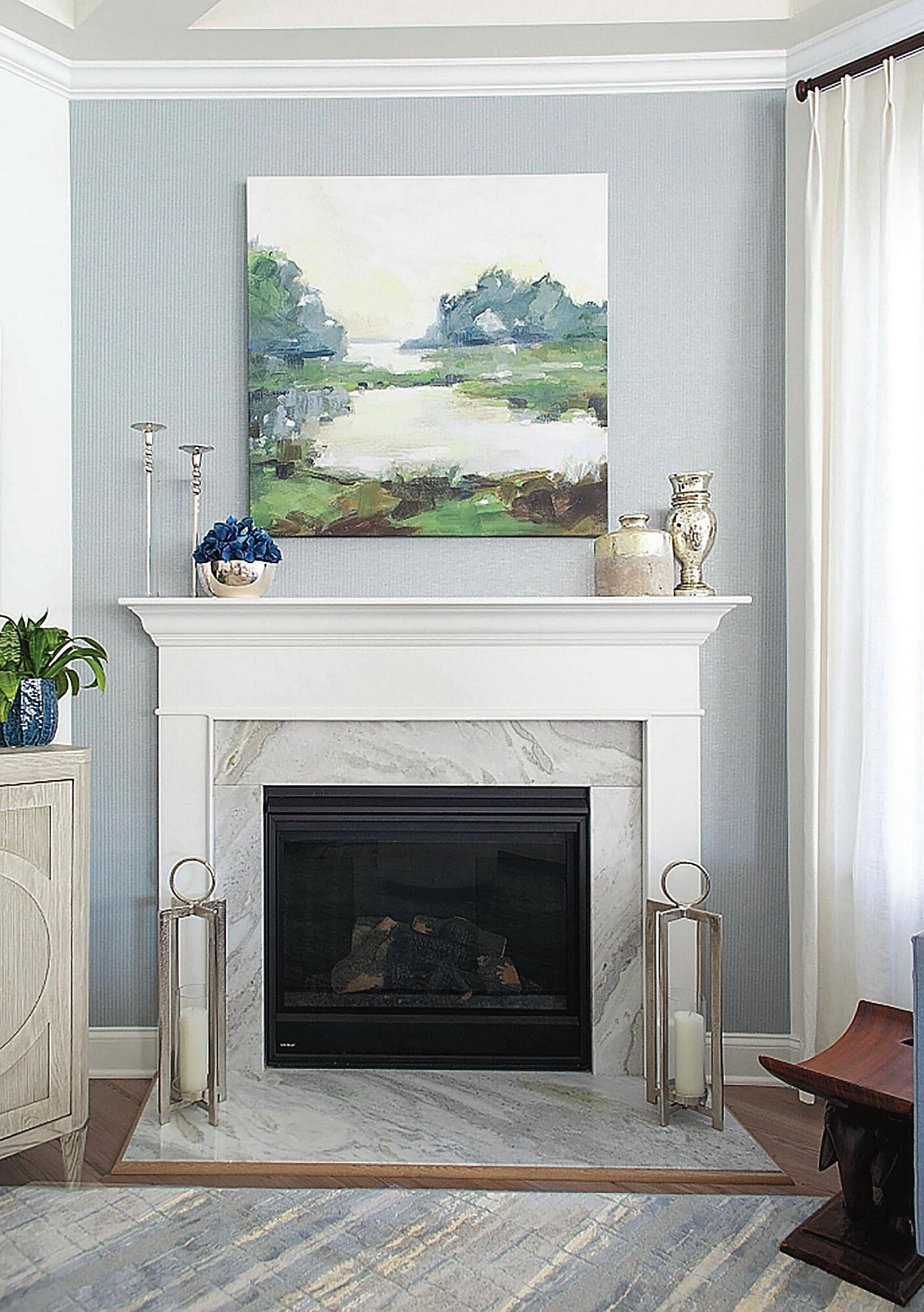 A focal point in the living room is the fireplace, so Granert treated its flanking built-ins to Thibaut grass cloth. The grass cloth, which she calls a welcome alternative to floral wallpaper, delivers dimension to shelving niches. Because antique mirror tiles above the fireplace contributed neither warmth nor dimension, she worked with an art curator to procure the landscape painting that now ties in the warm brown of hardwood floors. Not a strong pattern, but a ribbed texture with sheen enhances the monochromatic Jaipur rug, she says.