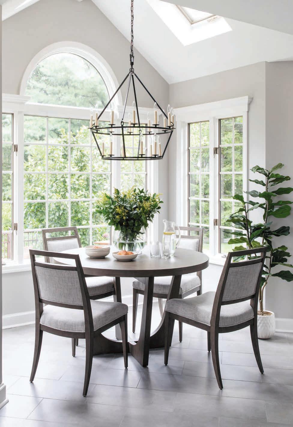 Bountiful windows and a skylight in a bright alcove set the stage for the breakfast nook, where the round table by Lexington Furniture says cozy with its warm rich brown. “It’s a really sunny room,” says Granert—so she ensured longevity with fade-proof fabric chairs. With black again as an accent, she introduced a two-tier metal chandelier. With attention to details such as easy maintenance, Granert’s goal was a timeless design. “Investing in your home is expensive,” she says. “You want to make sure that the things you’re recommending are going to have longevity so the client can appreciate and enjoy the space for many years.”