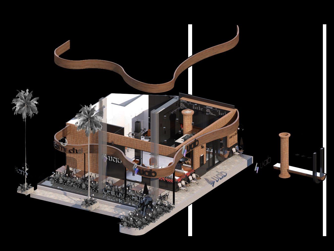 Building upon the original “floaty boxy” design concept, the outdoor area maintains harmony with the existing aesthetic by incorporating boxy shapes. To infuse the space with a lively mood, illuminated lights pulsate in rhythm with the beat, creating an engaging atmosphere for patrons. Additionally, curtains sway gracefully with the flow of air, adding movement and dynamism to the ambiance. The cascading water feature enhances the sensory experience, offering soothing sounds of flowing water. Atop the bar counter, a modern sculpture in the shape of a moon floats, serving as a captivating focal point that adds a touch of whimsy and intrigue to the space. This architectural design seamlessly blends form and function, creating an outdoor area that is both visually captivating and inviting for patrons to enjoy.