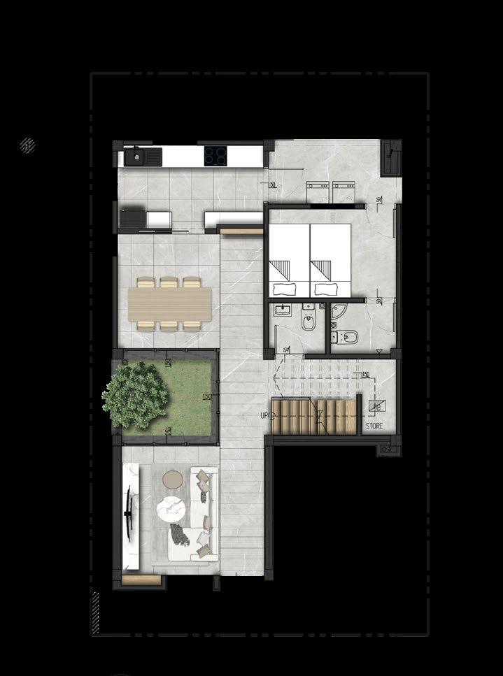 The objective was to design a home for a couple that encompassed all necessary spaces, including a home office, within a long rectangular plot. The green space was divided into two sections, with the front area serving as a semi-private space and the rear area designated as private. The focal point of the design was the inclined stair gesture, transformed into the main feature that gracefully connects around the building. This architectural element not only serves a functional purpose but also enhances the visual appeal of the design, creating a dynamic and engaging spatial experience.