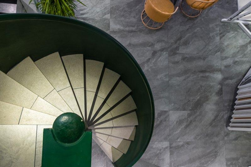 The interior design draws inspiration from the color palette of the Niro Granite logo, incorporating lapped color sheet treatments into the facade design. A prominent green spiral serves as the focal point, seamlessly weaving through the space and accentuating its dynamic atmosphere. The ground floor showcases the captivating spiral feature, while the mezzanine floor houses the office space, providing a functional yet aesthetically pleasing environment. This innovative design concept not only pays homage to the brand’s identity but also creates a visually stunning and cohesive interior experience.