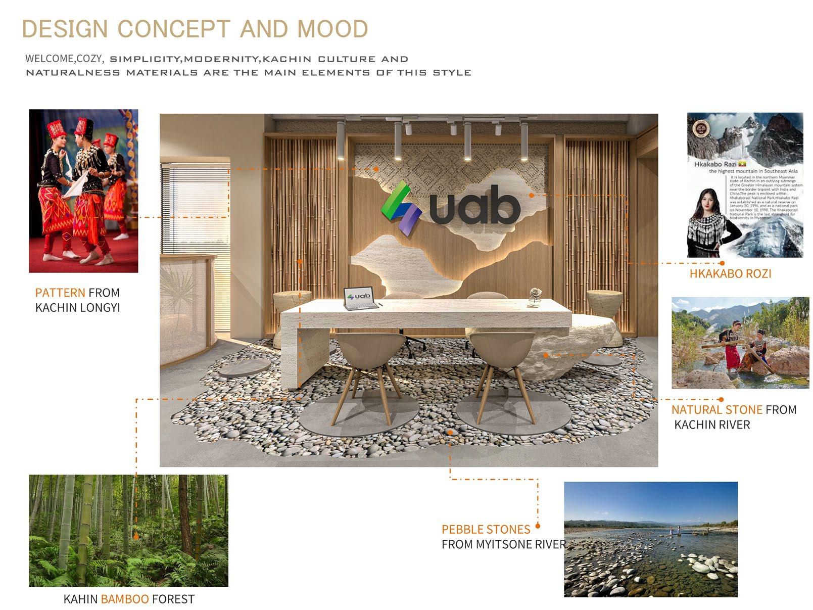 In Myitkyina, Kachin State, where the rich Kachin culture and natural materials abound, the architectural design incorporates elements inspired by local traditions. A block feature wall draws from the intricate patterns of the Kachin longyi, while stones sourced from the Myitsone and Kachin rivers imbue the structure with authenticity. A backdrop of bamboo, sourced from the surrounding forests, adds a natural element, while the mountain-shaped design pays homage to the iconic Hkabo Rozi, symbolizing the majestic mountains of Southeast Asia. This concept aims to create a welcoming, cozy, and modern atmosphere, enriching the Kachin culture through a harmonious blend of natural textures and a muted color palette.