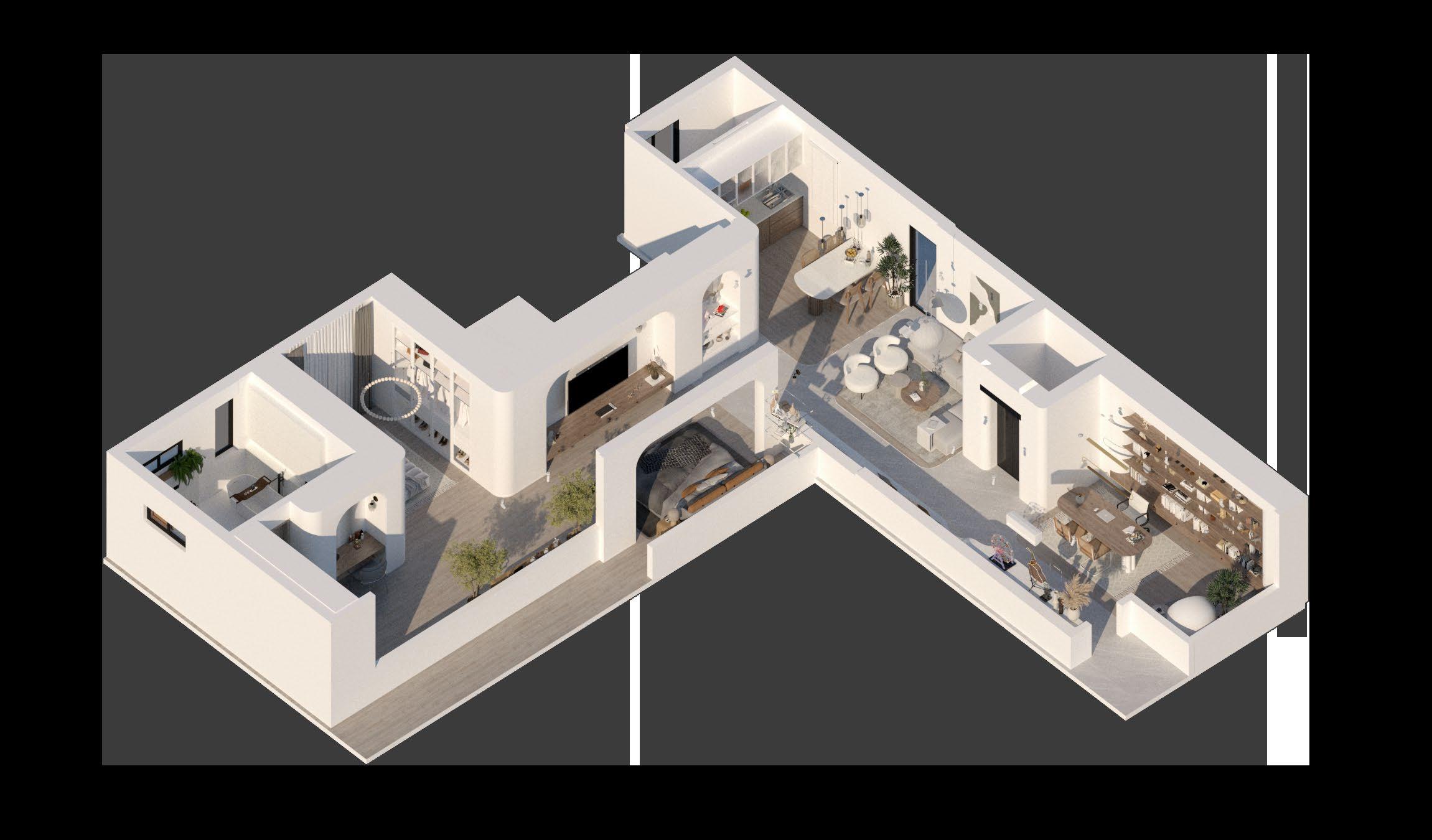 The client’s vision for the interior design is one of minimalist elegance, emphasizing cleanliness, lightness, and the appreciation of life’s simple pleasures. Asymmetry, simplicity, modernity, and the use of natural materials are central to achieving this style. To soften the existing sharp edges, the design focuses on creating a smooth and harmonious environment that seamlessly blends with the concept of simplicity. A monochromatic palette dominates the space, punctuated by subtle touches of natural materials such as wood, stone, and woven textures. This approach creates a serene and inviting atmosphere, promoting a sense of calm and tranquility while allowing for the enjoyment of life’s uncomplicated beauty.