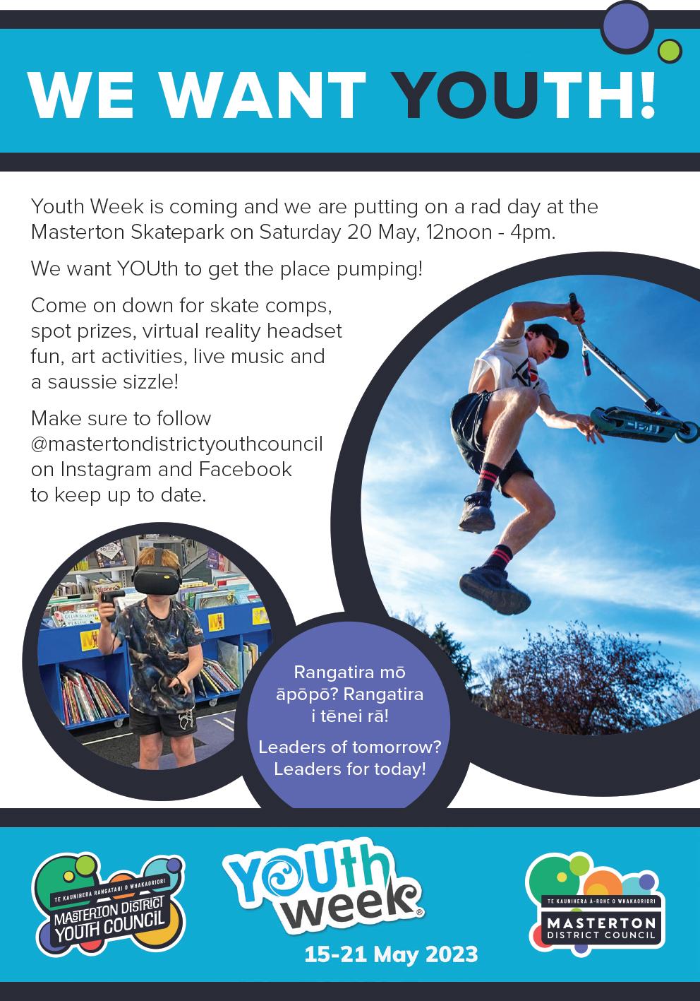 • The Masterton Skatepark youth event is on Saturday, May 20, from 12pm-4pm. For more information, or to get involved, email youthcouncil@ mstn.govt.nz
