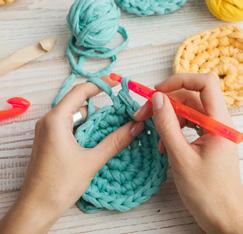 Create textiles using a crochet hook to interlock loops of yarn, thread, or strands of other materials. The name is derived from the French term croc, which means ‘hook’.