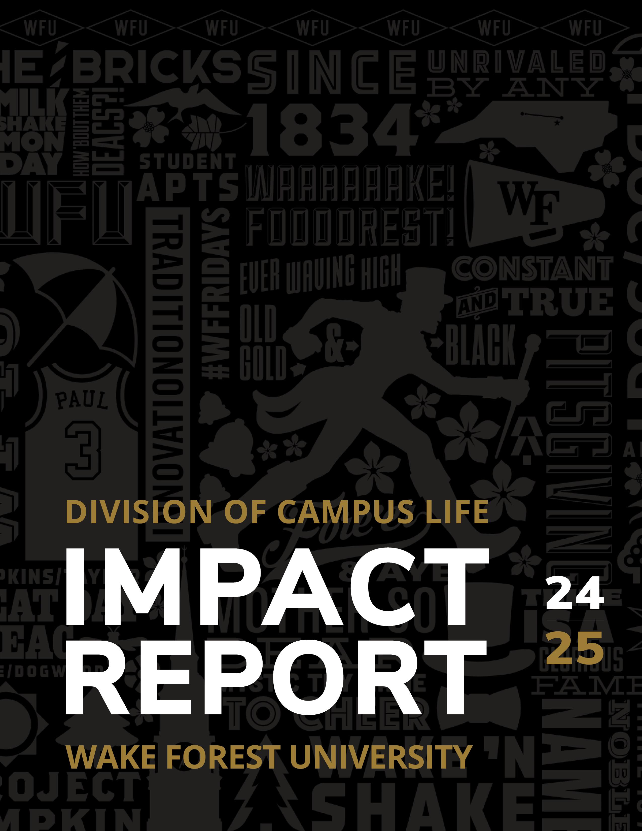 The Division of Campus Life at Wake Forest University is dedicated to fostering a campus community where every individual is valued, included and empowered to flourish. Our purpose is rooted in our motto, Pro Humanitate (“for humanity”). With nearly 300 professionals, we have long prioritized assessment and evaluation. Recently, our focus has shifted to evidencebased practice. While participation and satisfaction data are important, we aim to answer the more compelling question: “Why did it matter?” The subsequent pages of this impact report provide the answers.