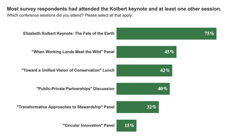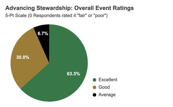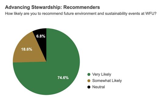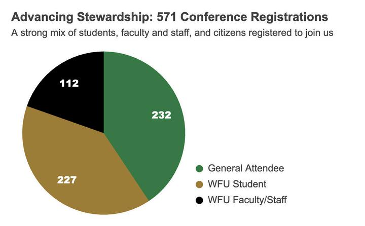 ⏵ Events. Our October conference, Advancing Stewardship, welcomed 12 leading practitioners, representing federal government, global, national, regional NGOs, and industry voices, as well as Pulitzer Prize winner Elizabeth Kolbert for our keynote. Of the 584 registrations, 39% were students, 19% were faculty and staff, and 40% were engaged citizens and practitioners from the region. We saw 100-150 attendees at each of our Thursday panels and nearly filled the Brindle Auditorium for the keynote. Feedback was overwhelmingly positive, both in our follow-up survey and anecdotally. The Future of Environmental Protection, our March event with Gina McCarthy and Janet McCabe, was equally successful. We filled the Broyhill Auditorium for the keynote and moderated discussion in the evening, with 359 registrations: half of the audience were citizens and practitioners, roughly a third were students, and the rest were WFU faculty and staff. For both events, we also created several opportunities for more direct student engagement with our esteemed guests, through specific course outreach, open discussions, and small group meals. Both events received highly positive feedback, with over 50 people responding to our feedback surveys for each event. The vast majority rated our events highly and stated that the programs increased their perceptions of Wake Forest University as dedicated to addressing and a leader in advancing and sharing the knowledge critical for environmental and sustainability challenges.