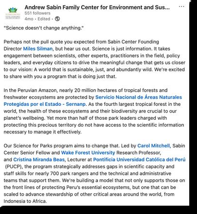 ⏵ Science for Parks (SFP). Science for Parks (SFP) is a key component of the Sabin Center's global conservation model focused on integrating science, governance, and social equity to support the effective management of protected areas, indigenous lands, and working wildlands. In Peru, SFP partners with the national parks service (SERNANP) to improve access to scientific information for staff responsible for managing approximately 20 million hectares of tropical forests and freshwater ecosystems. Currently, more than half of SERNANP’s rangers and staff lack the scientific data needed to inform management decisions. To address this, SFP Peru launched a curriculum titled Science Governance for Peruvian Protected Areas, engaging participants from SERNANP and affiliated government, research, and academic institutions. The training included eight virtual sessions, a two-day in-person workshop in Peru, and a two-week technical visit to Yellowstone and Rocky Mountain National Parks, where senior Peruvian professionals learned about U.S. National Park Service management practices. In March, the initiative supported the co-development of a Roadmap for Science Coordination for Protected Areas