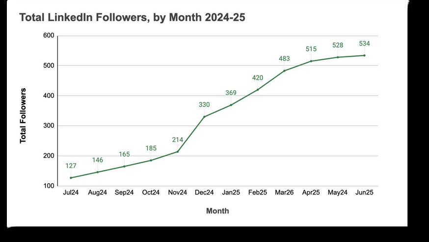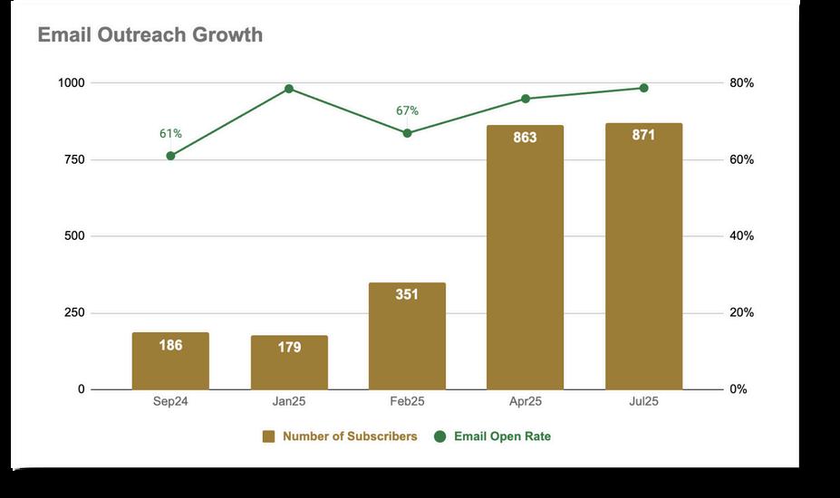 ⏵ Communications Outreach. This year, we launched an email newsletter, growing our audience to 884 subscribers. We also send out timely communications regarding events and opportunities, as well as targeted outreach to Faculty Affiliates. We typically see open rates of over 70% for our emails. We’ve established a presence on LinkedIn, growing our audience to well over 500 followers and reaching over 17,000 members in our organic