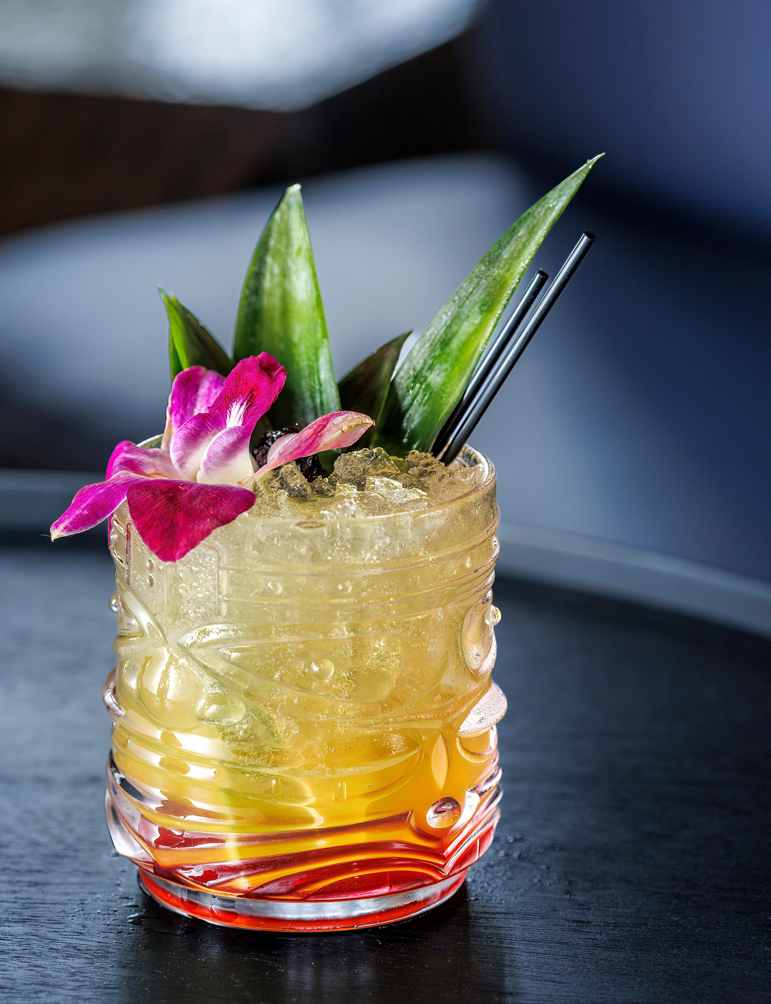 Shake all ingredients with ice and strain into a rocks glass. Fill with fresh ice and top with a splash of club soda. Garnish with a Luxardo Maraschino cherry and pineapple fronds.
