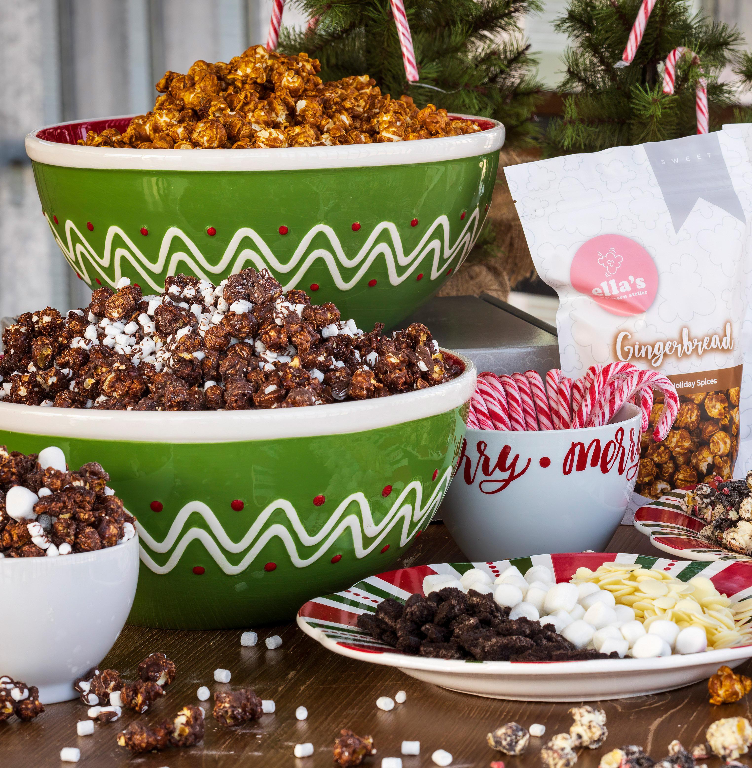 Otherwise known as Gingerbread, Hot Cocoa & Peppermint Cookies! Give the gift of happiness this holiday season. Ella’s Popcorn Holiday Trio Gift Box includes three comfort flavors. Hot Cocoa is brimming with homemade Dutch Cocoa and toasted marshmallow caramel then studded with nuggets of joy; teeny-tiny marshmallows. Gingerbread proudly boasts of the classic holiday flavors, with a snappy crunch and a warm ginger finish. Peppermint Cookie-O takes your taste buds on a magical sleigh ride through snowy pepper minty mountaintops.